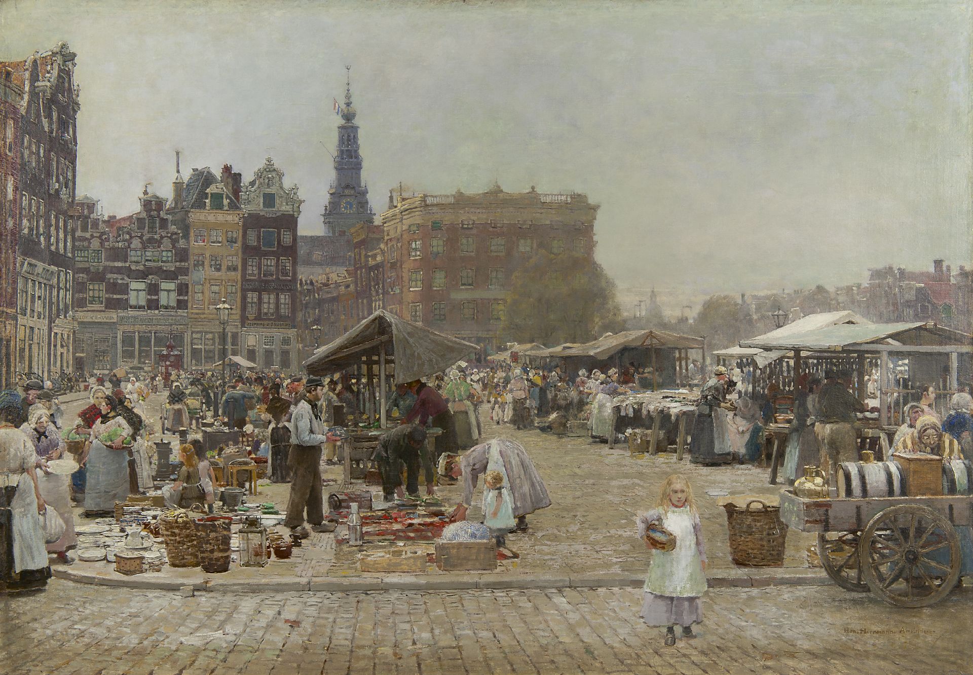 Hans Herrmann kunstwerk • schilderij • voorheen te koop Gezicht op de Nieuwmarkt, Amsterdam