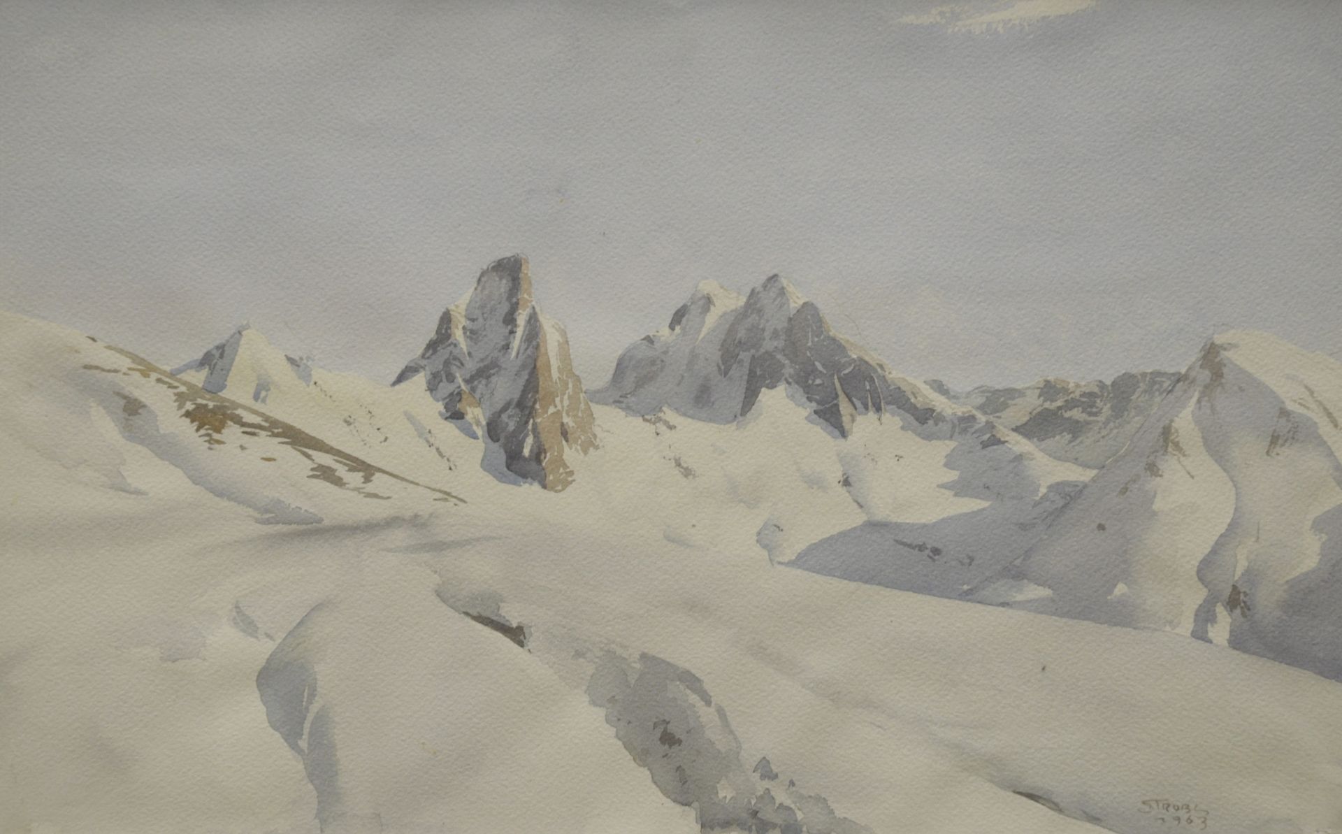 Dat deze aquarel van de berg Rüfikopf bij Lech in koninklijk bezit was is niet verwonderlijk. Al sinds 1960 komt de koninklijke familie hier immers voor de wintersport. De schilder Hans Strobl behoorde tot de belangrijkste kunstenaars van de streek Vorarlberg, in het uiterste westen van Oostenrijk, waarin Lech gelegen is. Strobl werd opgeleid aan de academie in Wenen en schilderde voornamelijk landschappen, bij zomer en winter, bloemstillevens en streekgebonden genretaferelen. Gezien de datering – 1963 – is het waarschijnlijk dat deze aquarel door koningin Juliana gekocht is, dan wel dat zij dit werk ten geschenke heeft gekregen van de kunstenaar.
