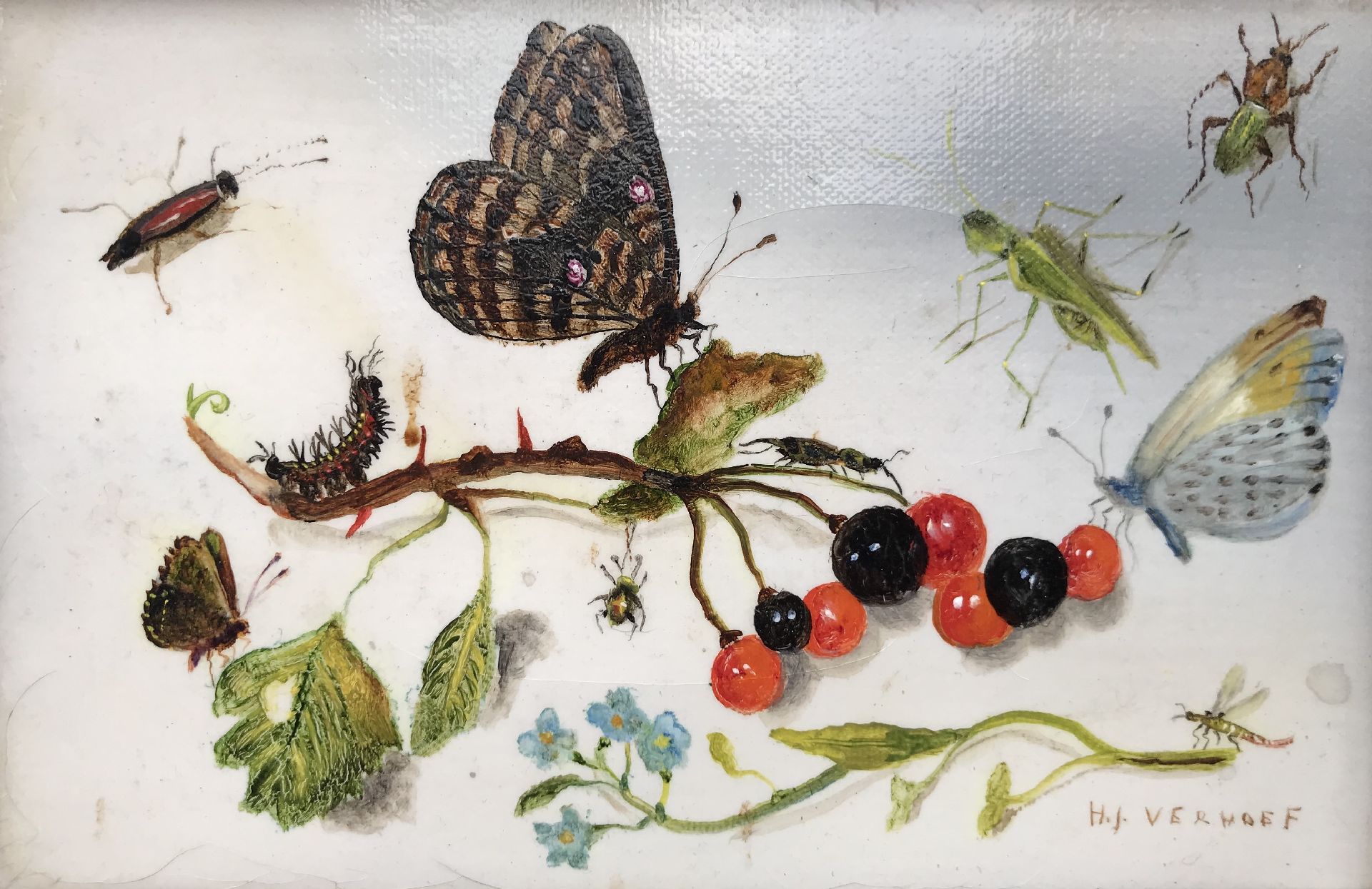 Verhoef H.  | Hans Verhoef | Schilderijen te koop aangeboden | Stilleven met vlinders, insecten en bessen, olieverf op doek 10,3 x 15,5 cm, gesigneerd rechtsonder