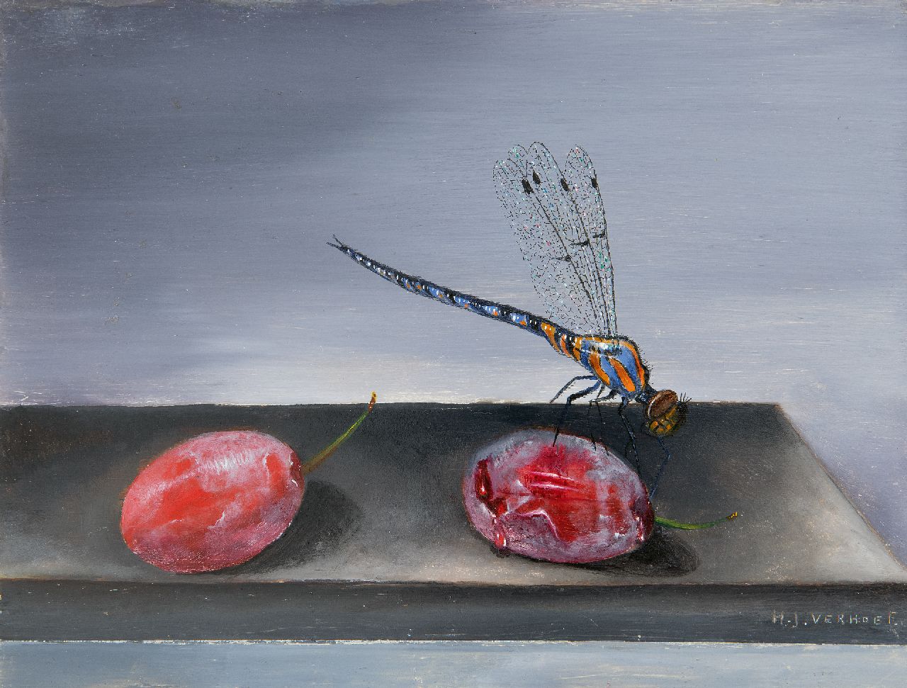 Hans Verhoef | Libelle en rode pruimen, olieverf op zink, 16,0 x 21,0 cm, gesigneerd r.o.
