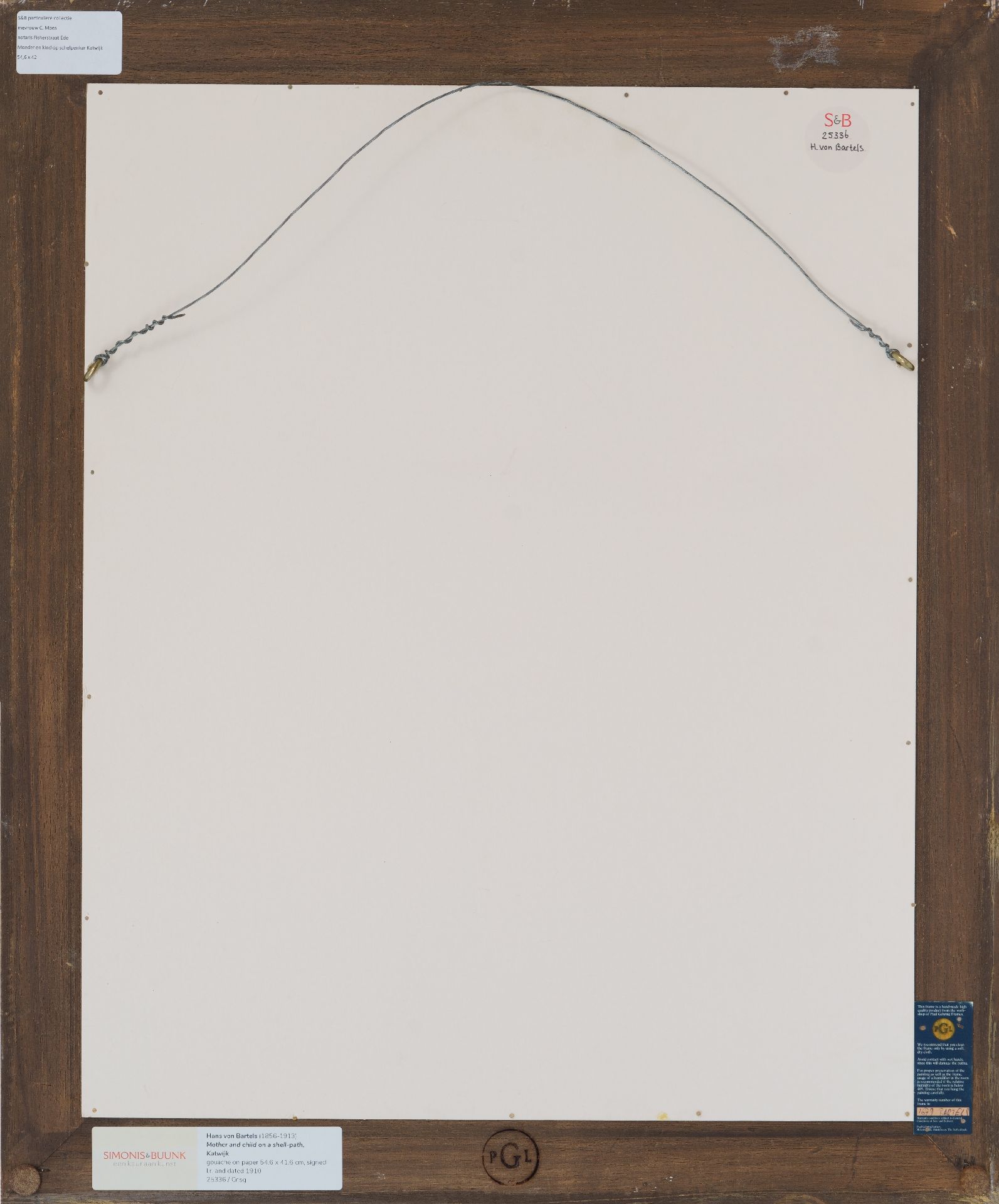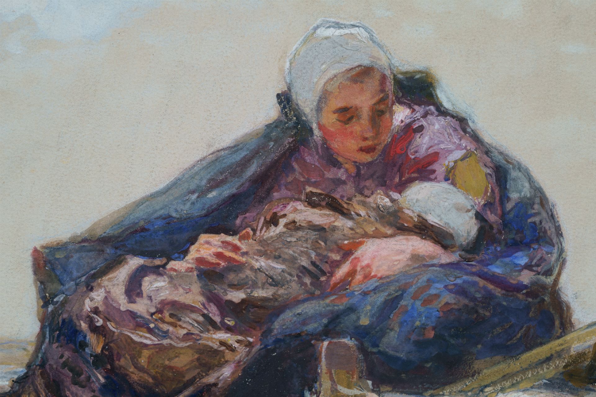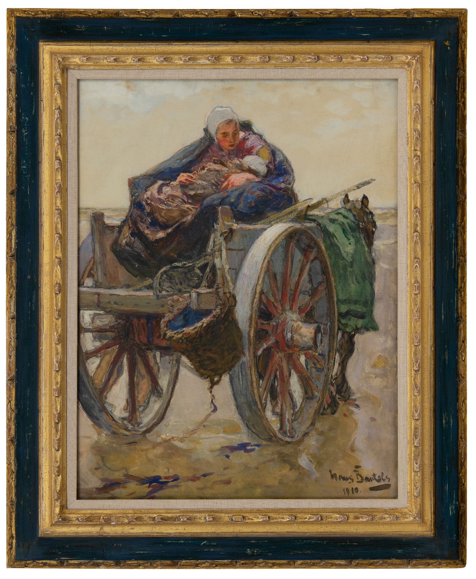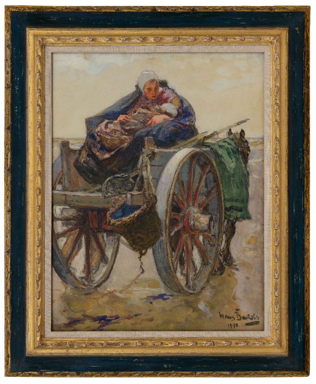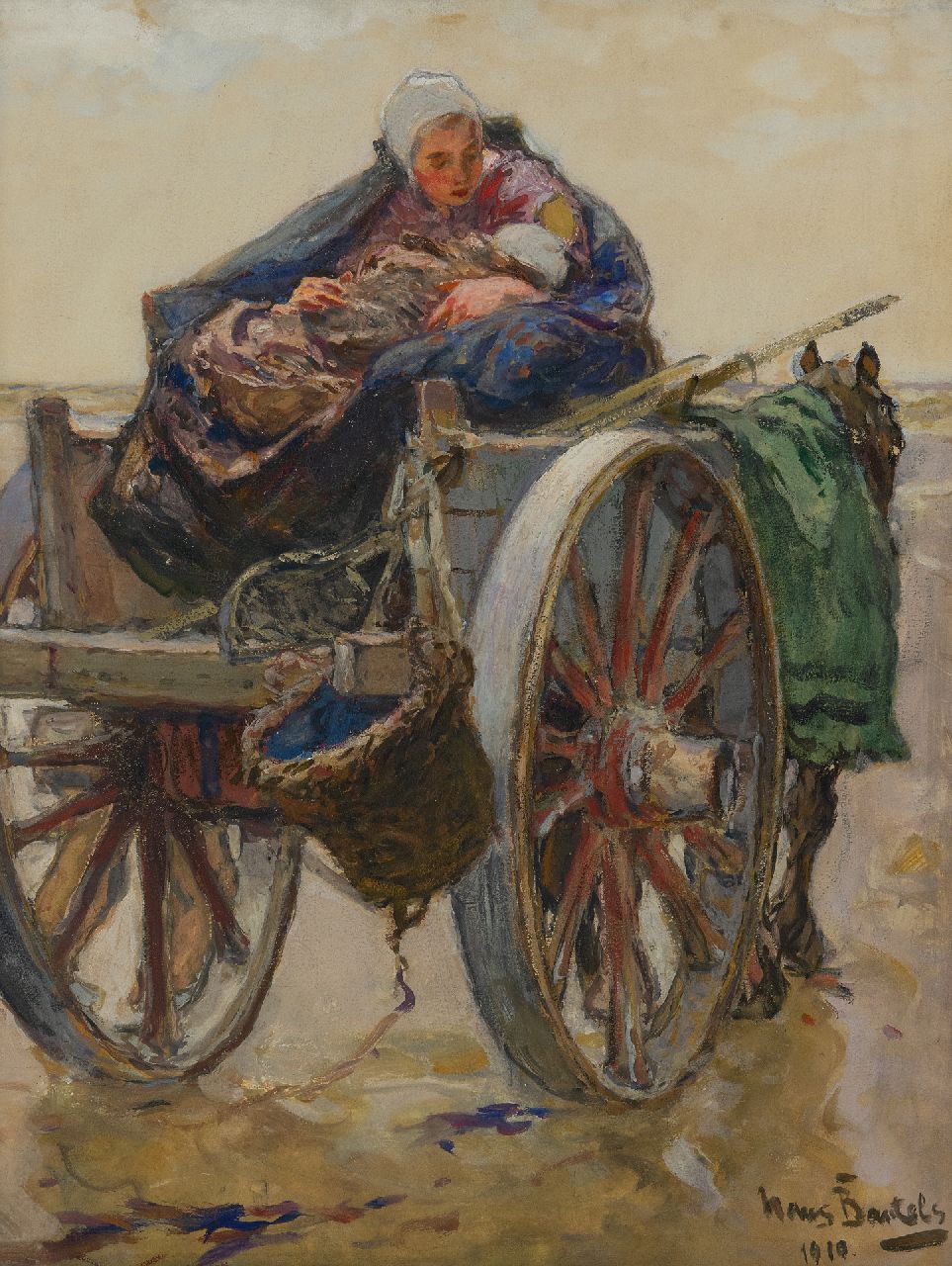 Hans von Bartels kunstwerk • aquarel • tekening • voorheen te koop Moeder en kind op schelpenkar te Katwijk