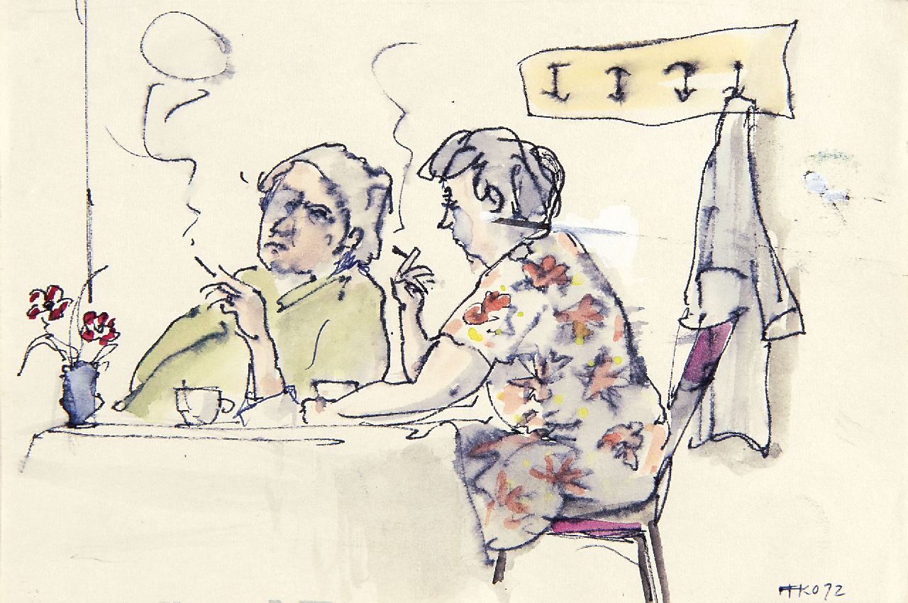 Harm Kamerlingh Onnes kunstwerk • aquarel • tekening • voorheen te koop Aan de koffie met een sigaretje