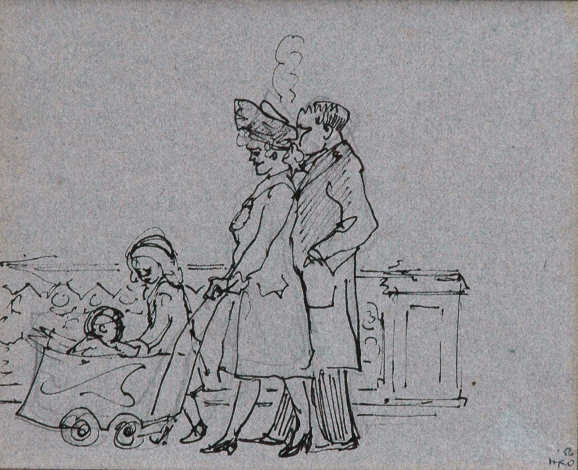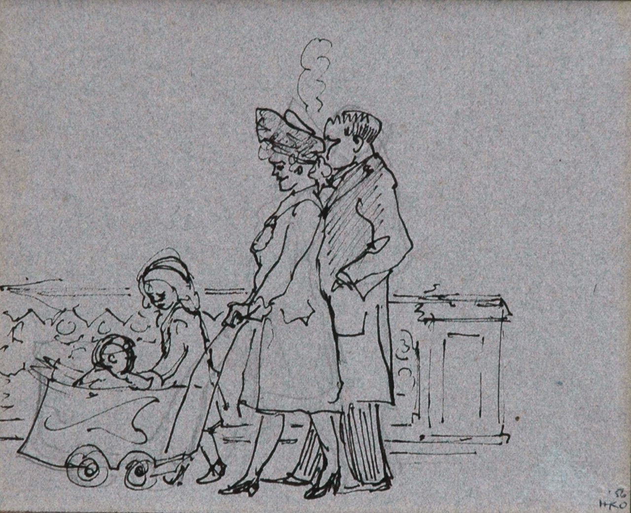 Kamerlingh Onnes H.H.  | 'Harm' Henrick Kamerlingh Onnes, De zondagse wandeling, pen en inkt op papier 14,8 x 17,8 cm, gesigneerd rechtsonder met monogram en gedateerd '56