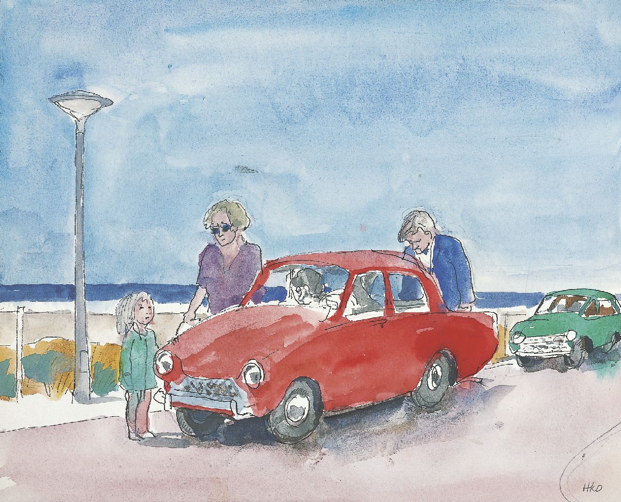 Harm Kamerlingh Onnes kunstwerk • aquarel • tekening • voorheen te koop Een dagje uit met de Daf