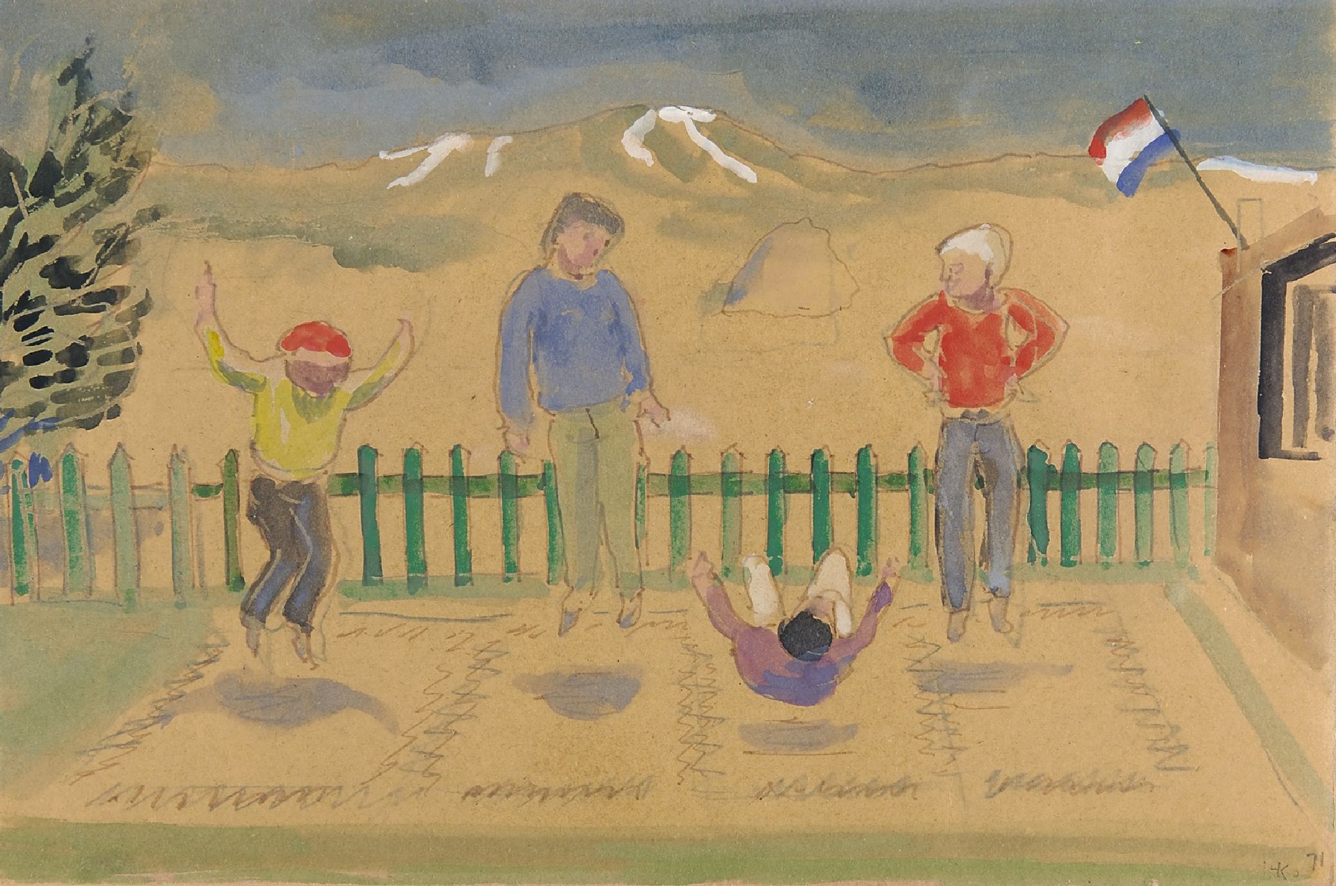 Harm Kamerlingh Onnes kunstwerk • aquarel • tekening • voorheen te koop Trampolinespringers op Terschelling
