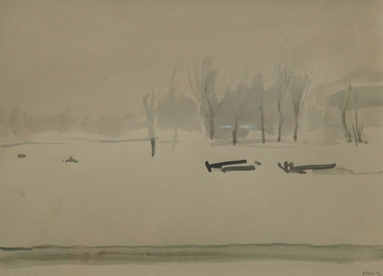 Harm Kamerlingh Onnes kunstwerk • aquarel • tekening • voorheen te koop Winter in het park