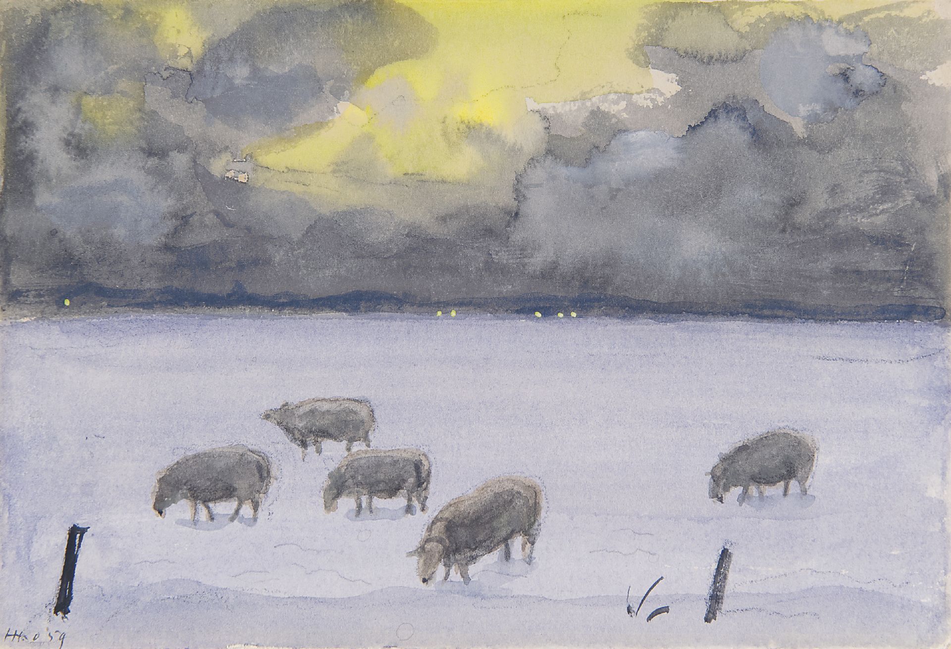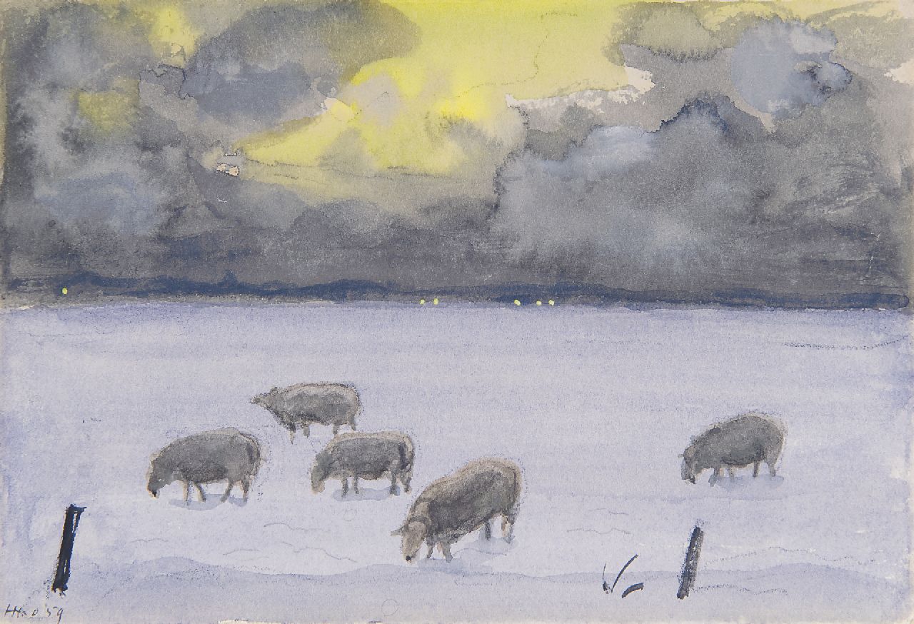 Harm Kamerlingh Onnes kunstwerk • aquarel • tekening • voorheen te koop Winterlandschap met schapen, Terschelling