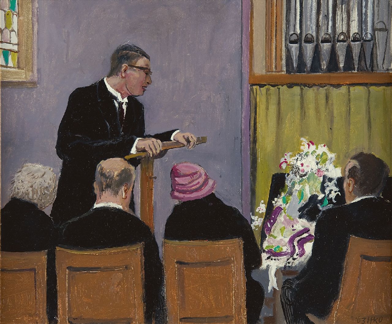 Harm Kamerlingh Onnes | Twee mensen bij een kerkconcert in Voorschoten, pen en inkt, krijt en aquarel op papier, 23,3 x 28,1 cm, gesigneerd r.o. met monogram en gedateerd '69