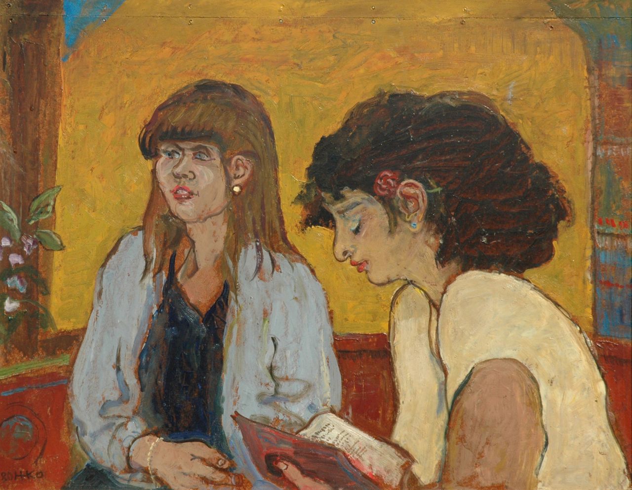 Kamerlingh Onnes H.H.  | 'Harm' Henrick Kamerlingh Onnes, Gedichten lezen, olieverf op board 43,3 x 54,5 cm, gesigneerd rechtsonder met monogram en gedateerd '80