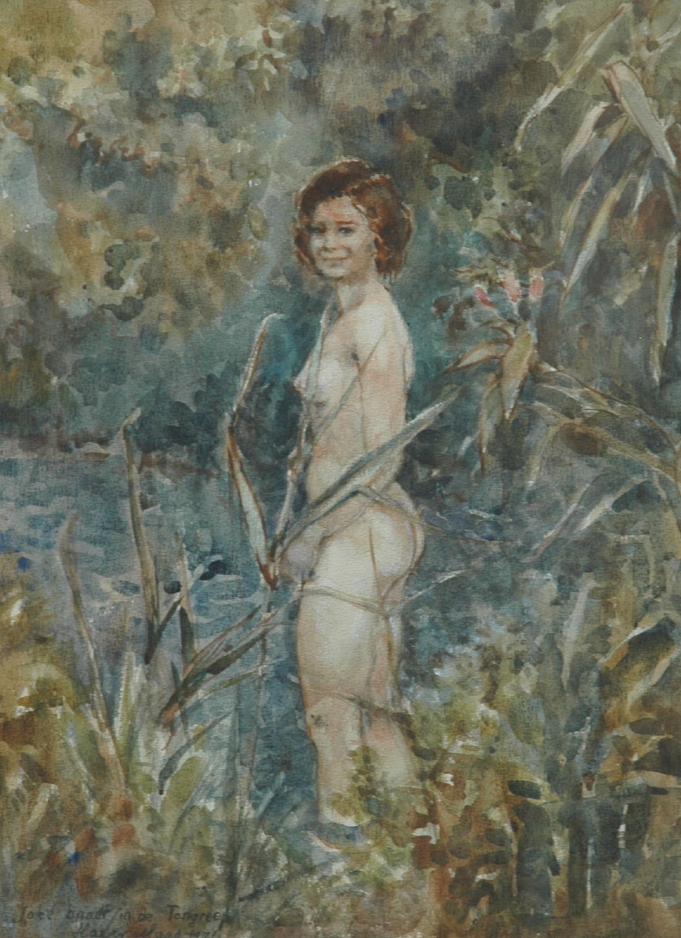 Harry Maas kunstwerk • aquarel • tekening • voorheen te koop Joke baadt in de Tongelreep