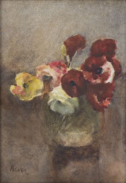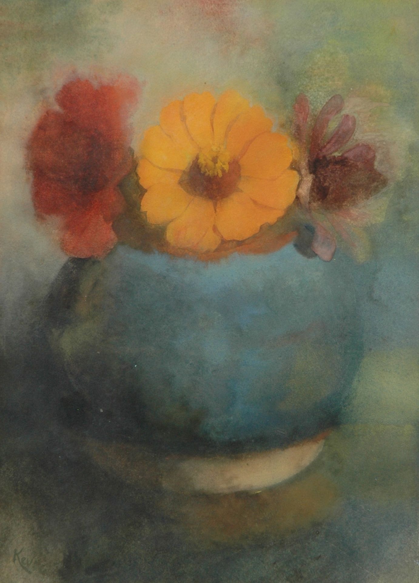 Hein Kever kunstwerk • aquarel • tekening • voorheen te koop Zinnia's in gemberpot