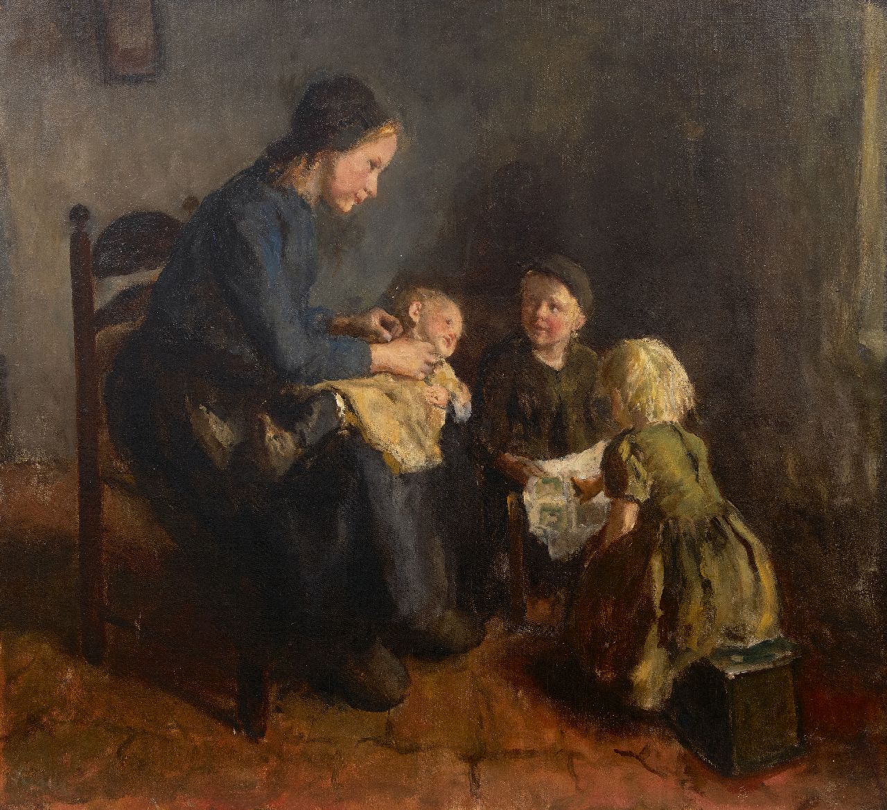 Hein Kever kunstwerk • schilderij • voorheen te koop Larens interieur met moeder en kinderen