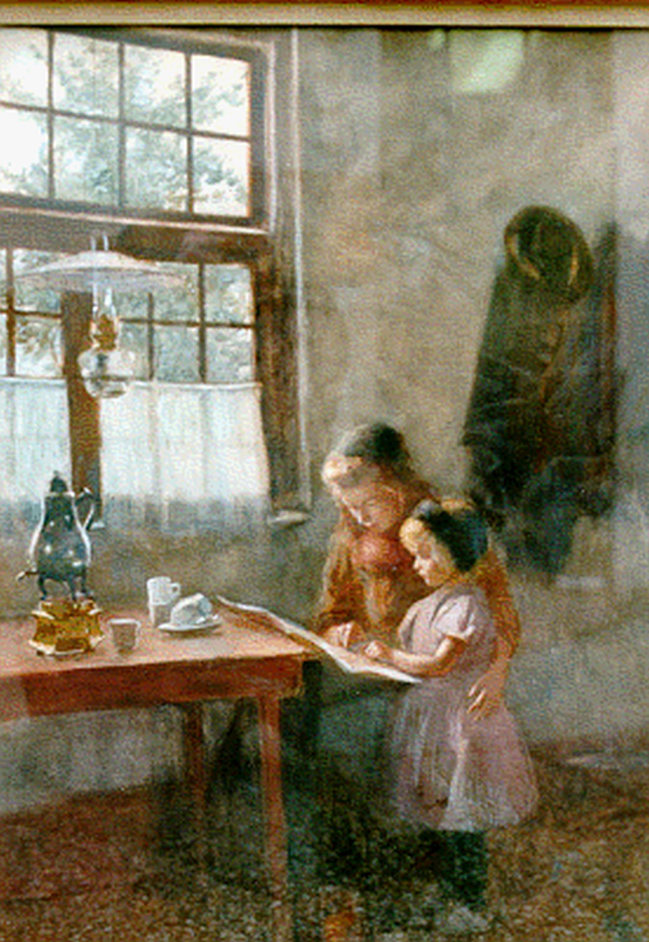 Heinrich Martin Krabbé kunstwerk • aquarel • tekening • voorheen te koop Lezende zusjes bij het raam