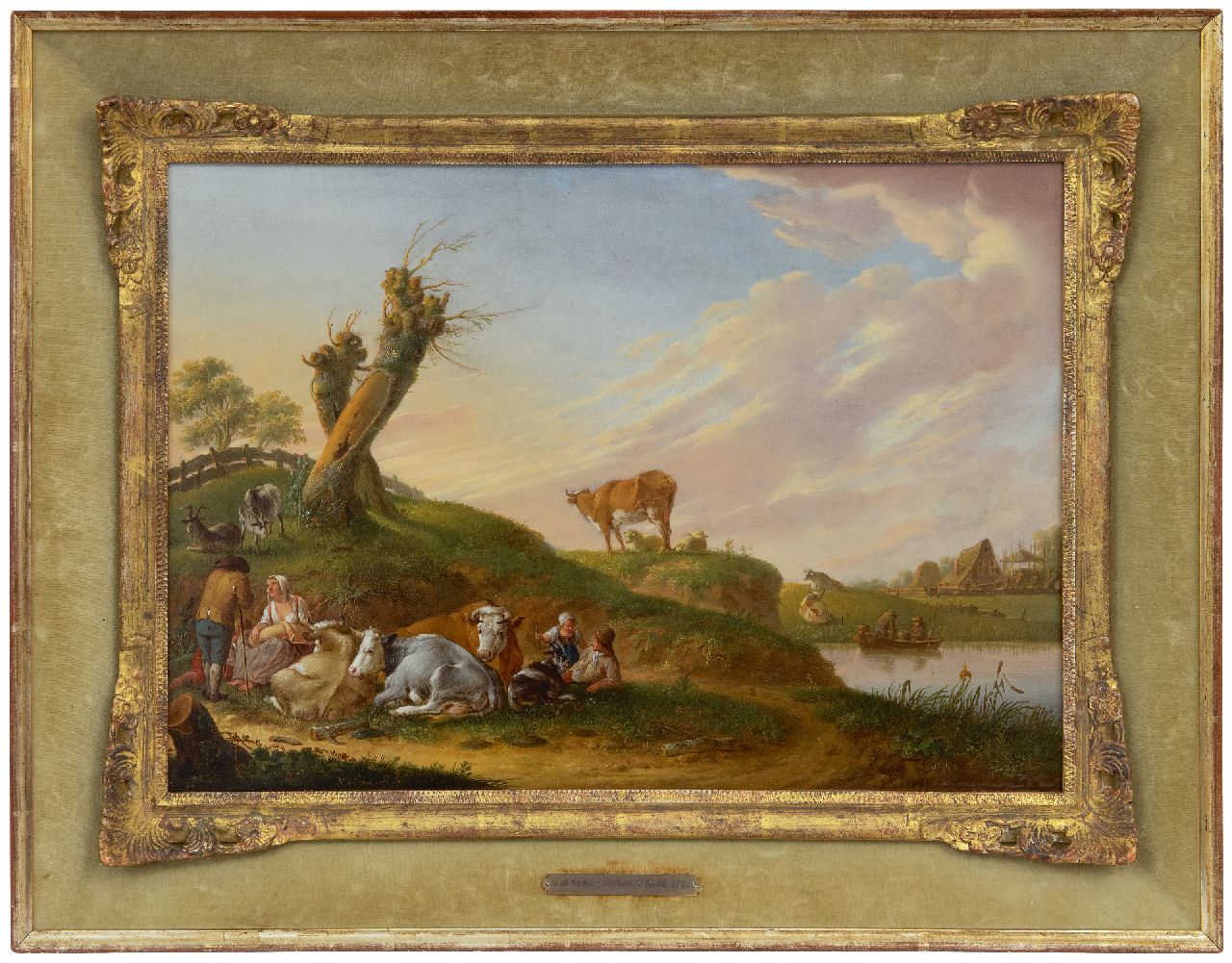 Heinrich Wilhelm Schweickhardt kunstwerk • schilderij • te koop Herdersfamilie met kudde aan een rivieroever