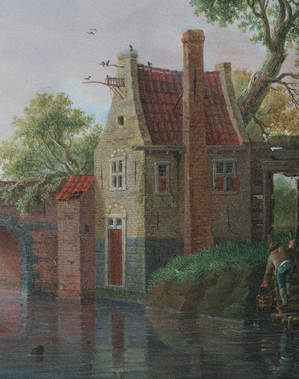 De uit Duitsland afkomstige schilder Heinrich Schweickhardt kwam omstreeks 1750 met zijn familie naar Den Haag. De grondbeginselen van het schildersvak leerde hij van Hieronymus Lapis. Aanvullend volgde hij lessen aan de tekenacademie van de Haagse Confrerie Pictura. In relatief korte tijd groeide Schweickhardt uit tot een belangrijk Haags schilder. Zijn oeuvre is breed, en omvat naast landschappen met vee en figuren, marines en riviergezichten ook behangselschilderingen en miniaturen. In 1787 verhuisde de kunstenaar naar Londen wegens toenemende politieke onrust in de Republiek. Hij gaf les aan zijn dochter Katharina Wilhelmina (1777-1830), die ook een getalenteerd dichteres was. Zij werd in 1797 de tweede vrouw van dichter Willem Bilderdijk die in 1795 een gastvrij onderdak had gevonden bij de familie.