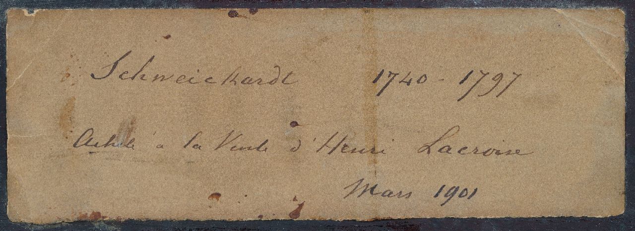 Literatuur: vgl: Eric Jan Sluijter, 'Hendrik Willem Schweickhardt (1746-1797); een Haagse schilder in de tweede helft van de achttiende eeuw', 'Oud Holland' 89 (1975), pag. 172, afb. 40.