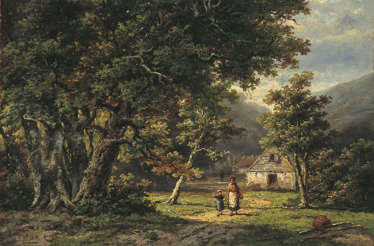 Hendrik Barend Koekkoek kunstwerk • schilderij • voorheen te koop Moeder en kind op een pad in een bosrijke vallei