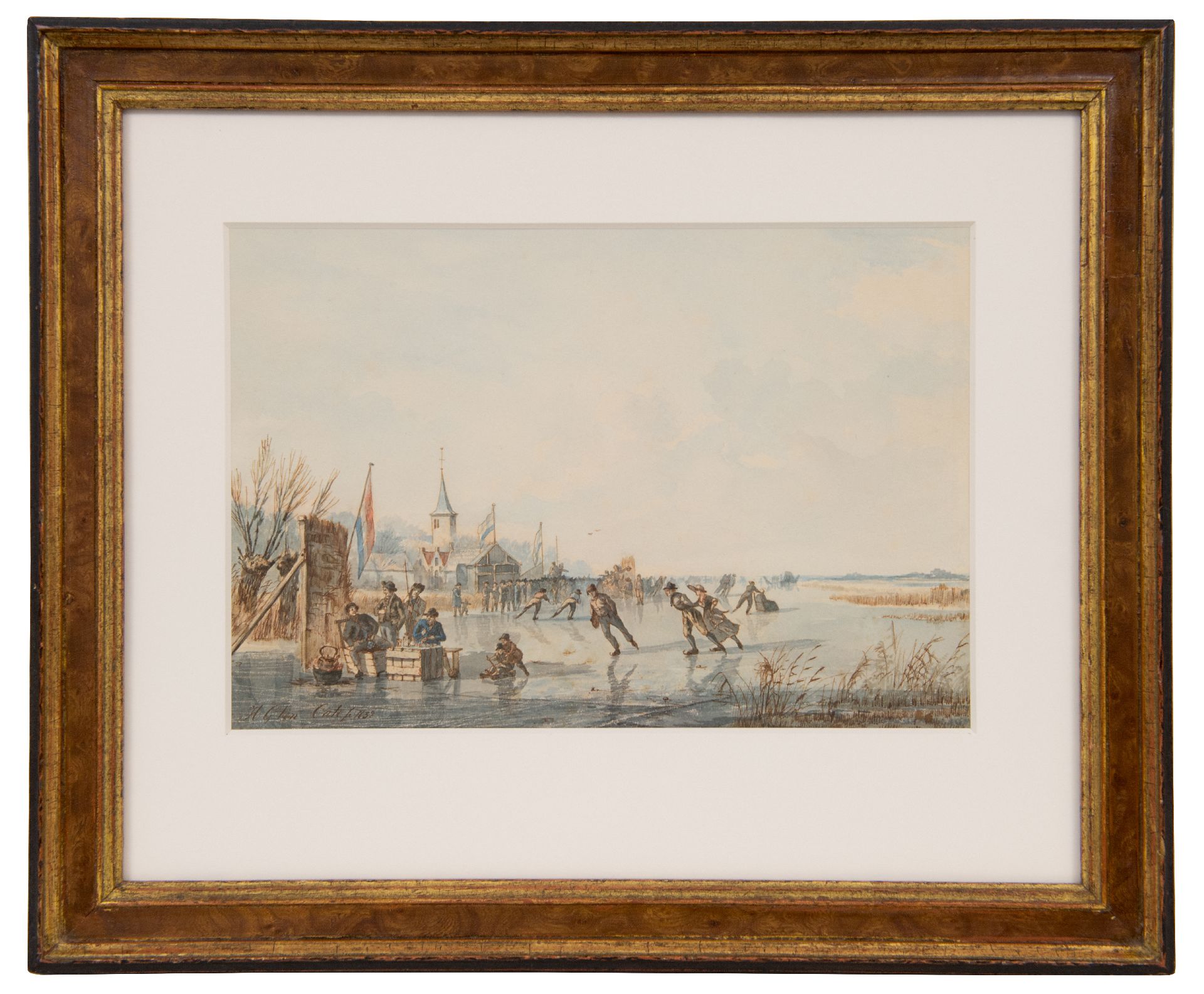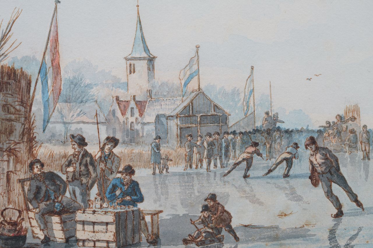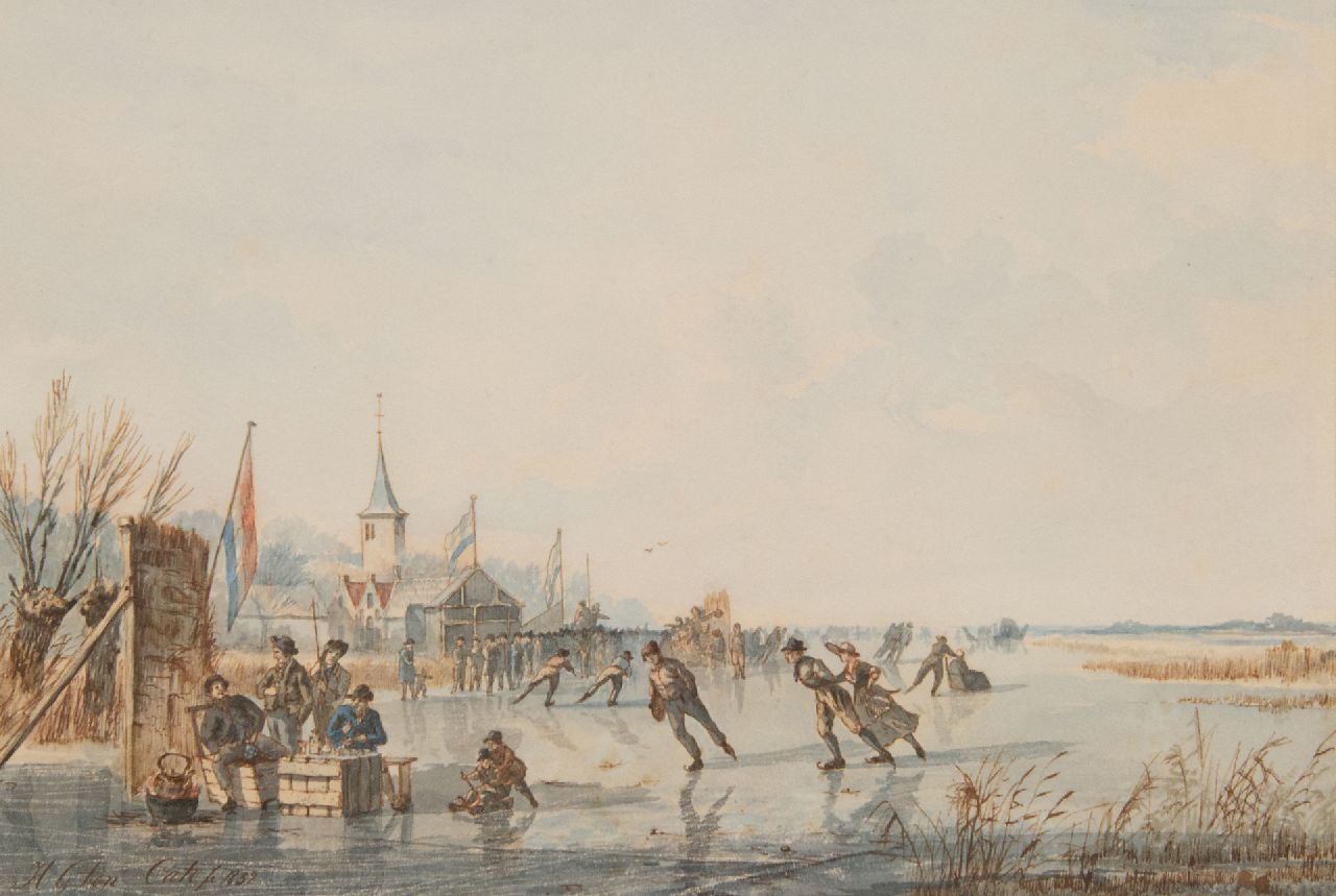 Hendrik Gerrit ten Cate kunstwerk • aquarel • tekening • te koop IJsvertier bij een schaatswedstrijd