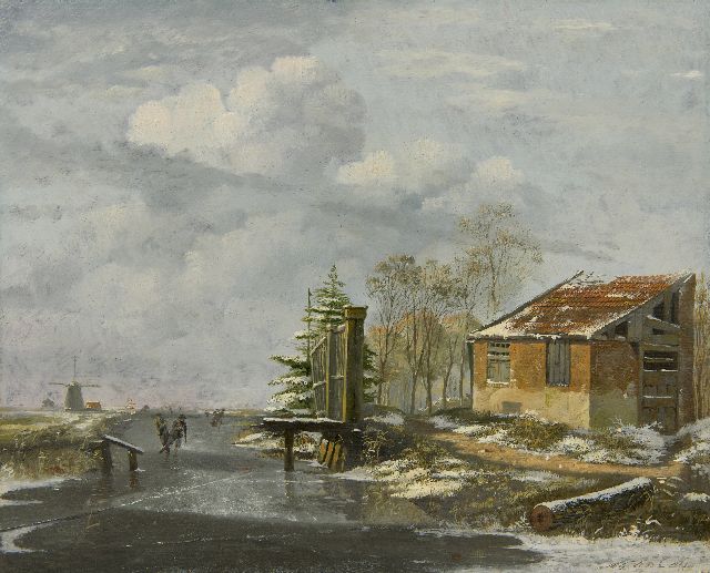 Hendrik Gerrit ten Cate | Schaatsers in een besneeuwd winterlandschap, olieverf op paneel, 25,8 x 31,9 cm, gesigneerd r.o.