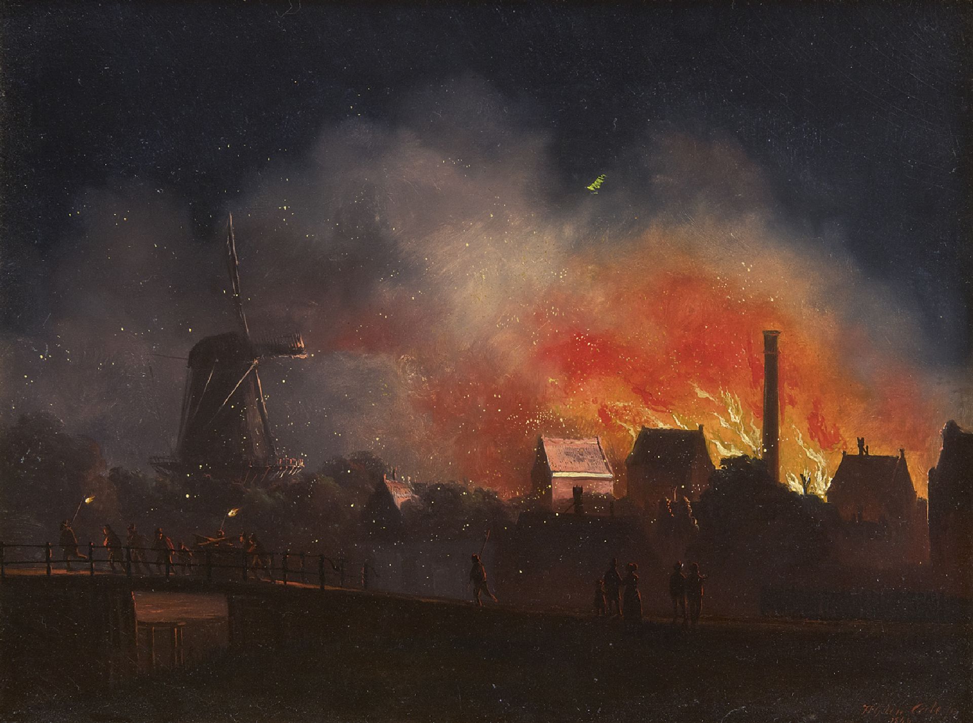 Hendrik Gerrit ten Cate kunstwerk • schilderij • voorheen te koop Uitslaande brand bij nacht (mogelijk de suikerraffinaderij van J.H. Rupe & Zn te Amsterdam, op 19 oktober 1845)
