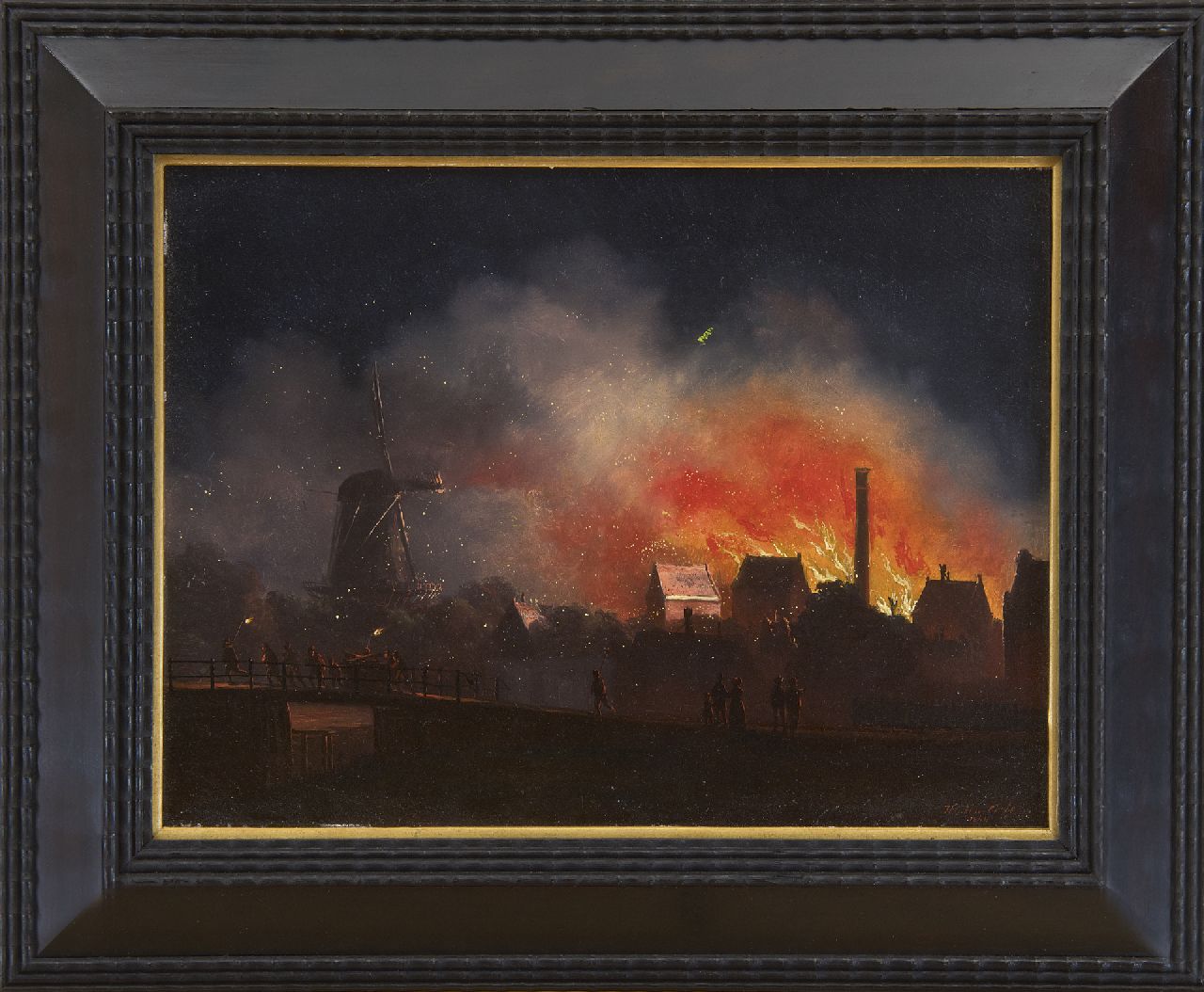 Hendrik Gerrit ten Cate is vooral bekend geworden als schilder van maanverlichte stadsgezichten, een genre dat bij de romantische verzamelaars in de 19e eeuw ongekend populair was. Daarnaast maakte hij ook portretten, bloemstillevens en zomer- en winterlandschappen. Ook zijn verfijnde Hollandse ijsgezichten, mooi uitgewerkt en gestoffeerd met figuren, zijn bij verzamelaars zeer geliefd. Dit schilderij uit 1849 zou de brand in de suikerraffinaderij van J. Rupe en Zoon te Amsterdam weergeven, die op 19 oktober 1845 plaatsvond. Vanaf de 17de en vooral 18de eeuw was de suikerraffinaderij de belangrijkste industrie van de stad en suiker was lang het belangrijkste Amsterdamse exportproduct. De fabrieken raffineerden de rietsuiker die vooral van plantages in het Caribisch gebied kwam. In de tweede helft van de 19de eeuw gaan steeds meer raffinaderijen suiker maken op basis van suikerbieten, waarbij de fabrieken kwamen te staan in het gebied waar de suikerbieten geteeld werden. De felle brand in 1845 was zó indrukwekkend dat hij nog jaren later onderwerp was van tekeningen en schilderijen.