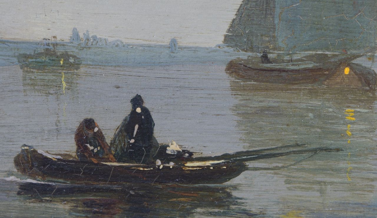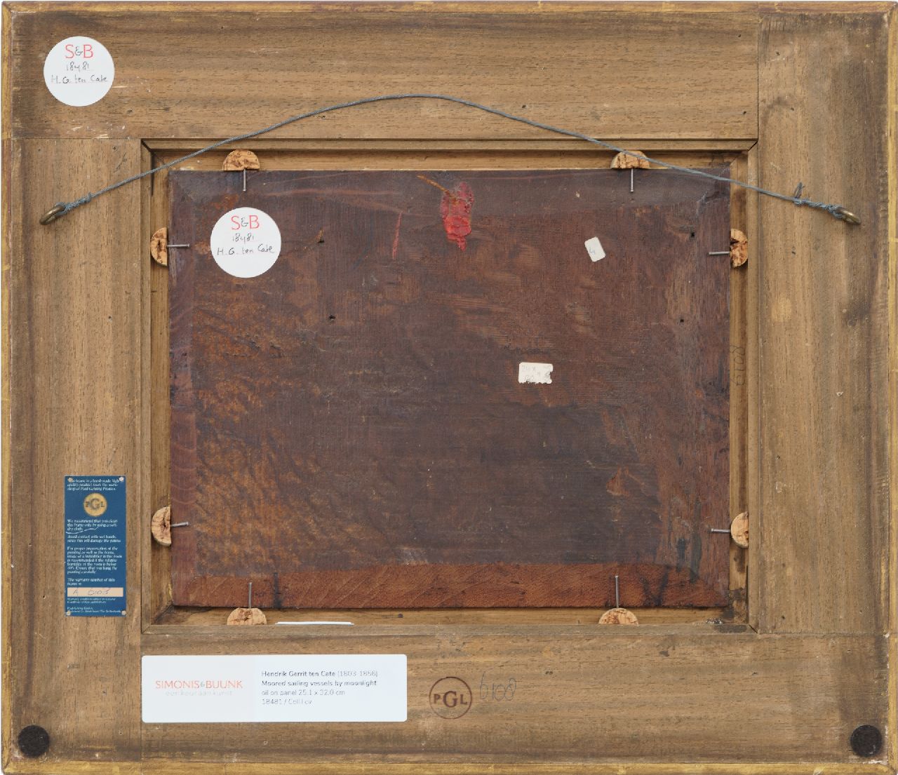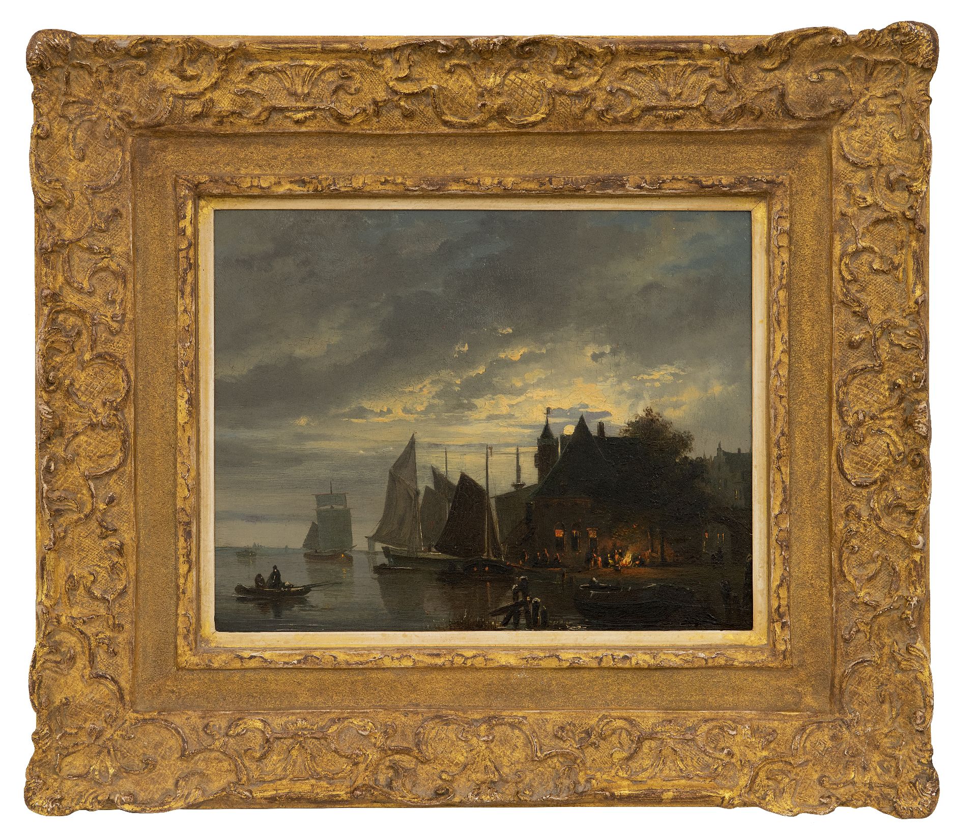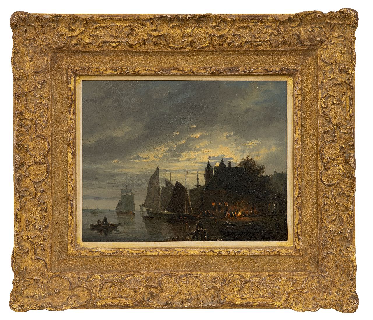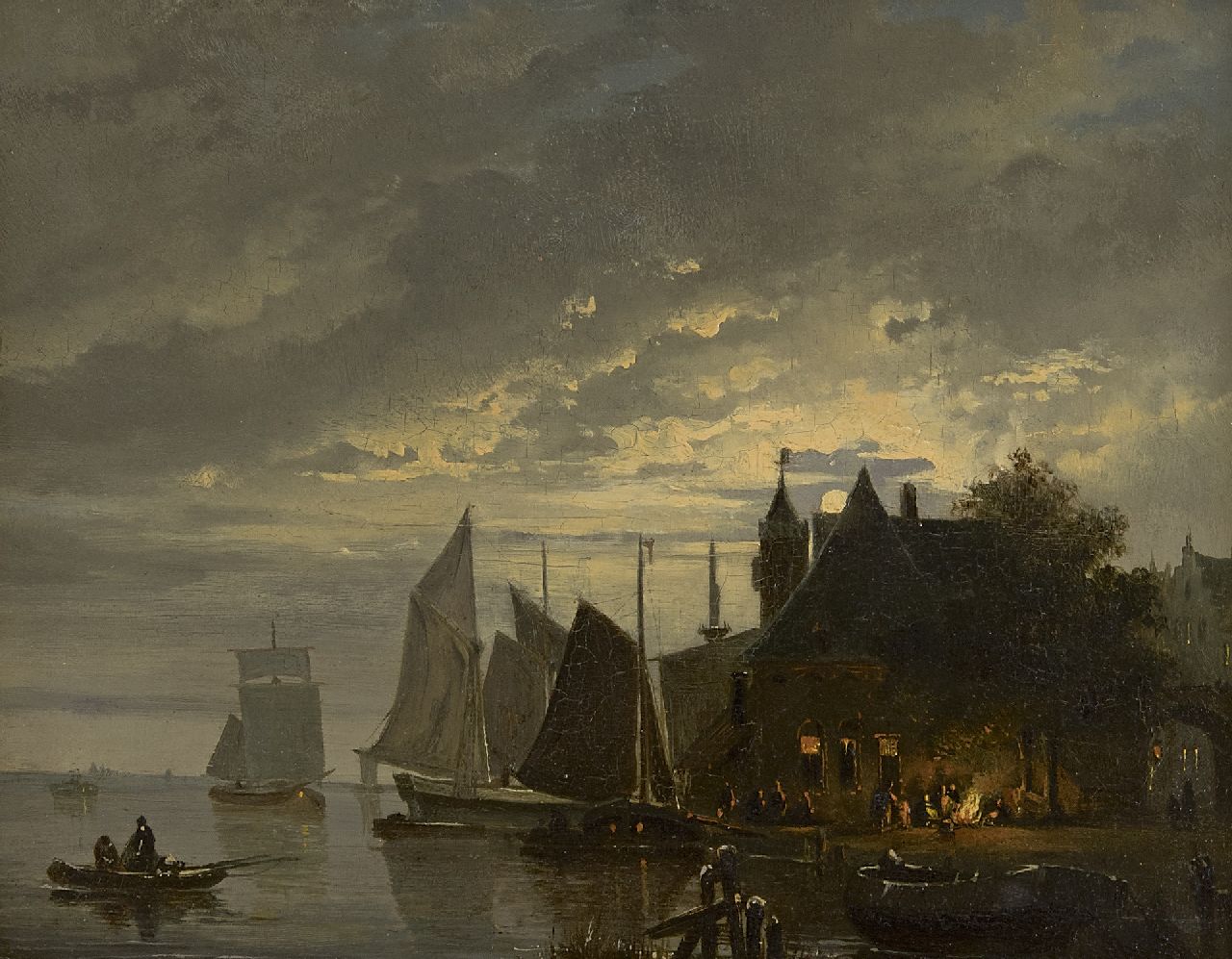Hendrik Gerrit ten Cate kunstwerk • schilderij • te koop Veerstoep en aangemeerde zeilschepen bij maanlicht