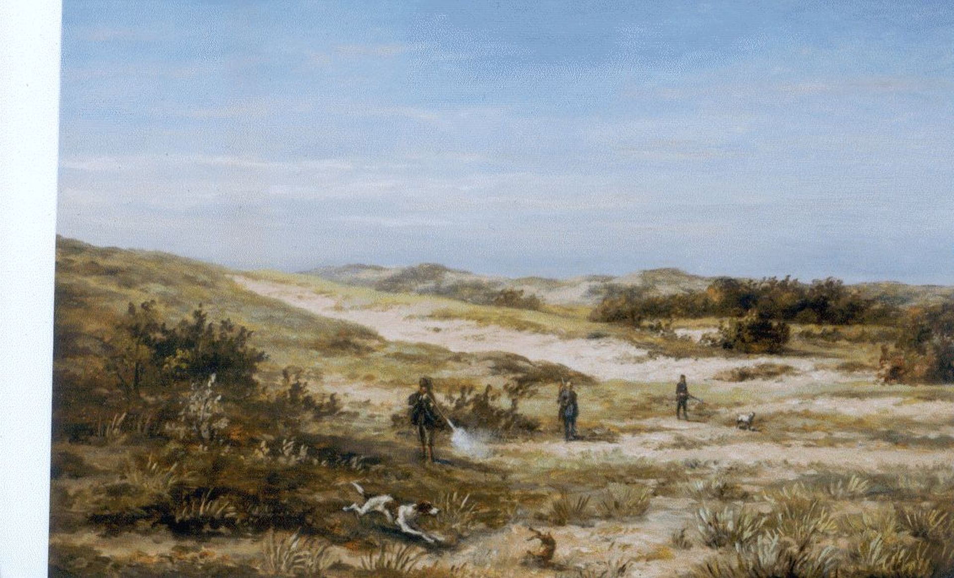 Hendrik Hulk kunstwerk • schilderij • voorheen te koop Jagers schieten een konijn in de duinen