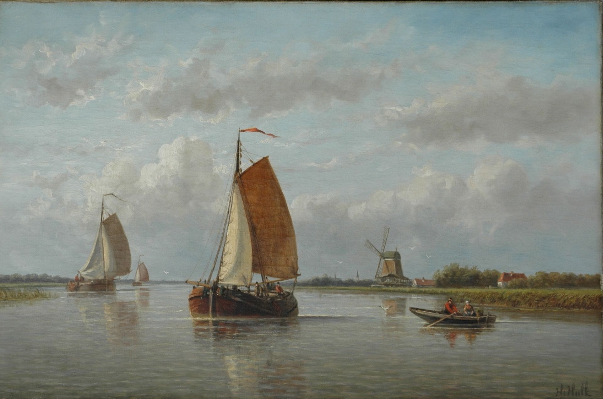 Hendrik Hulk kunstwerk • schilderij • voorheen te koop Platbodems in een riviermonding
