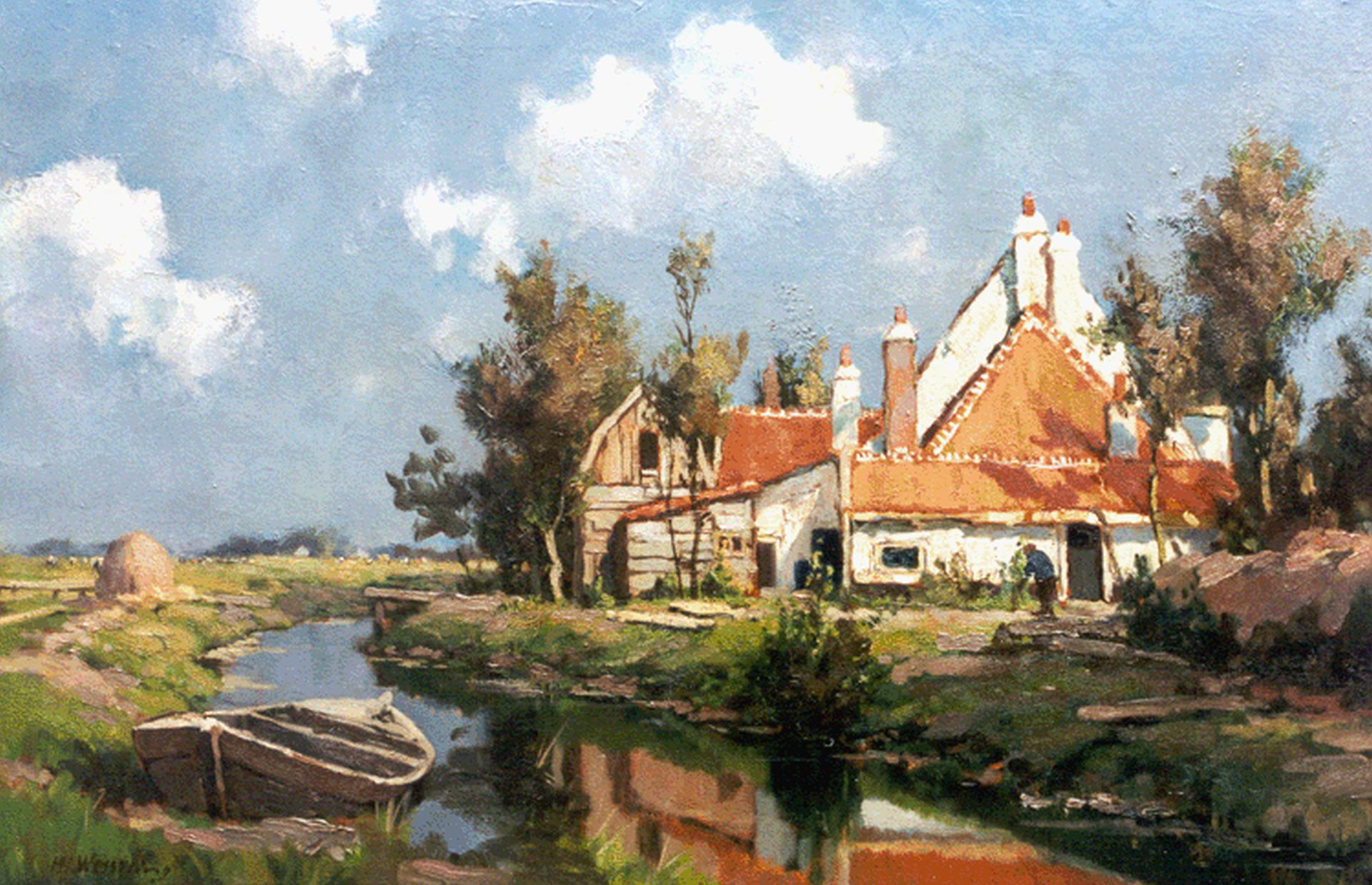 Hendrik Jan Wesseling kunstwerk • schilderij • voorheen te koop Boerenwoning aan een vaart
