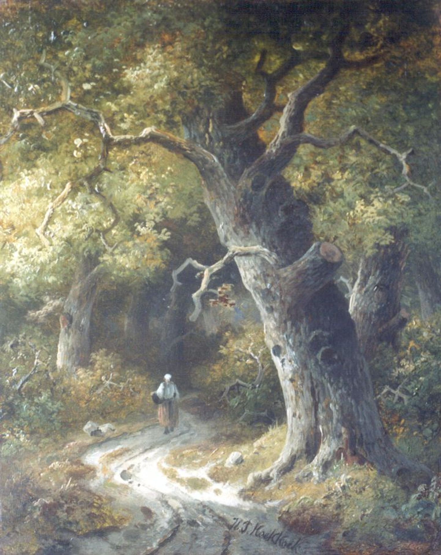 Hendrik Pieter Koekkoek kunstwerk • schilderij • voorheen te koop Boerenvrouw op een bospad