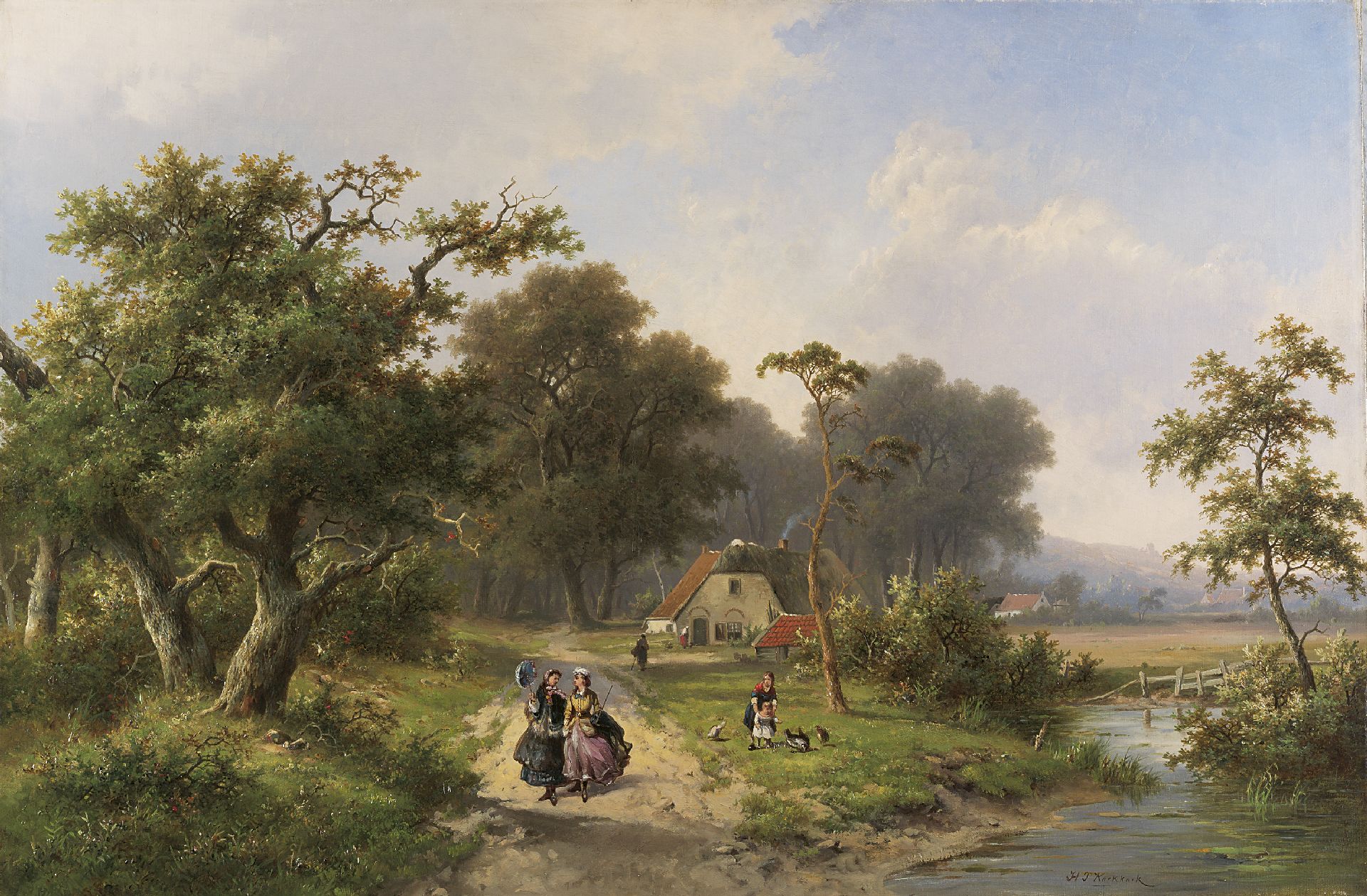 Hendrik Pieter Koekkoek kunstwerk • schilderij • voorheen te koop Elegante dames wandelend op een bospad, bij een boerenerf