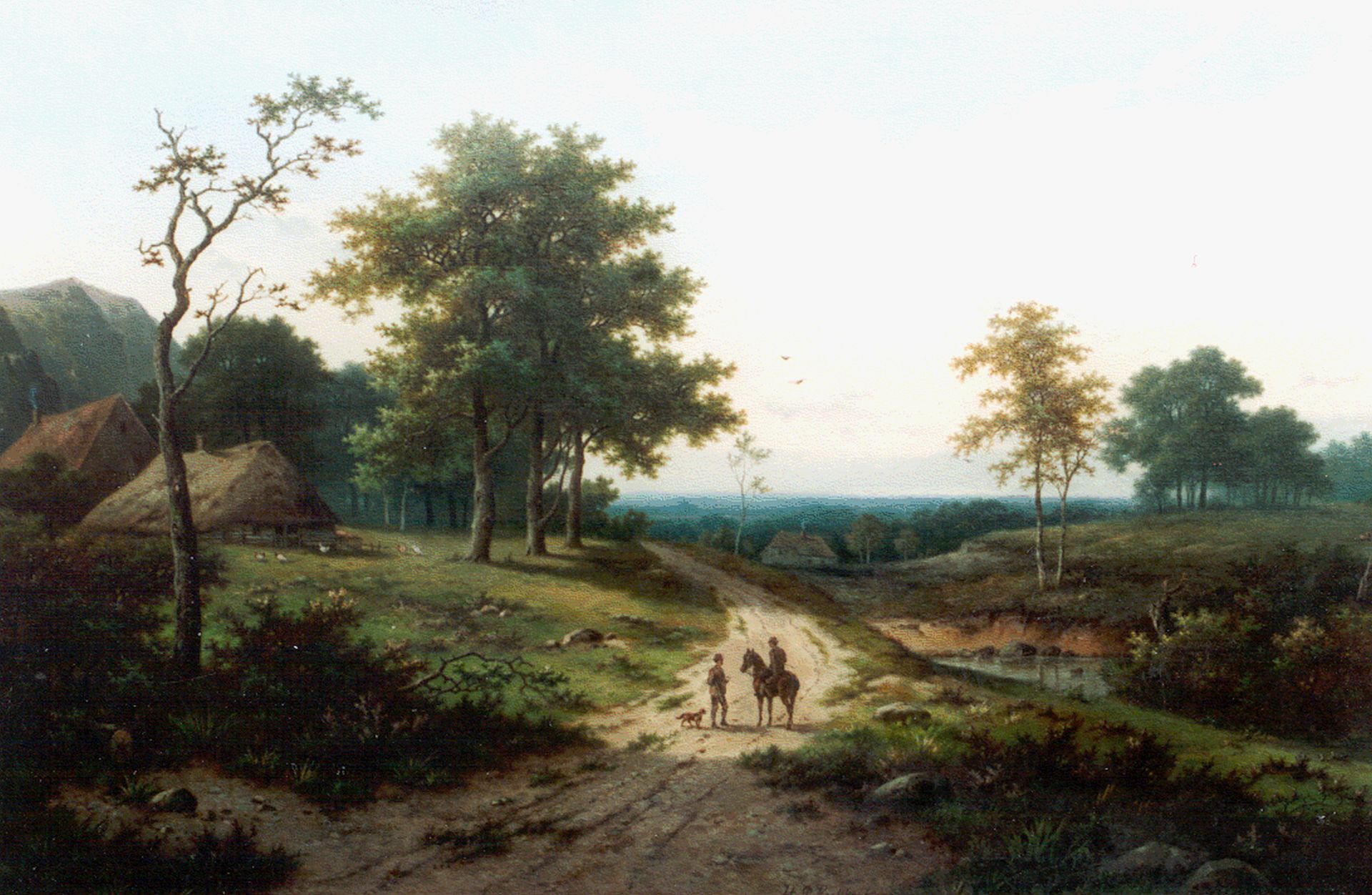 Hendrik Pieter Koekkoek kunstwerk • schilderij • voorheen te koop Heuvellandschap met paard en ruiter op landweg