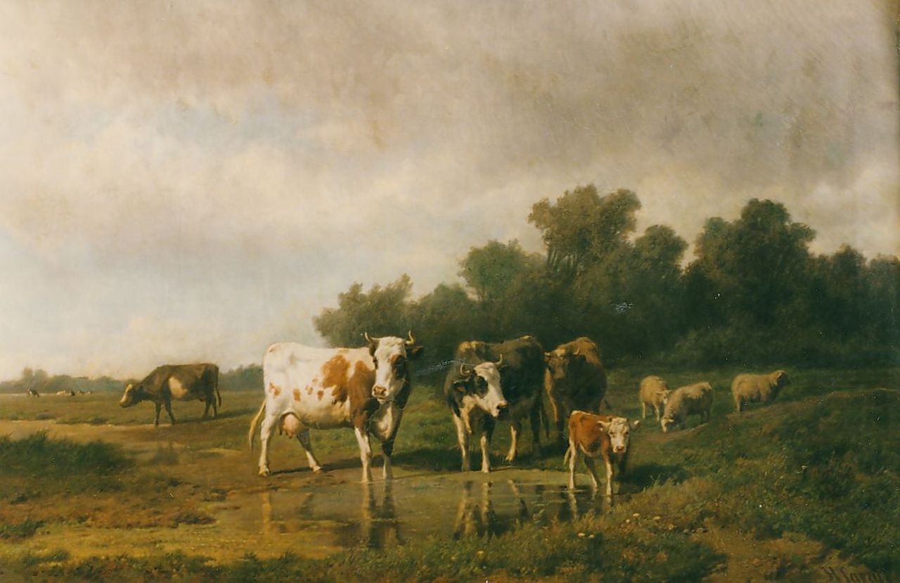Hendrik Savrij kunstwerk • schilderij • voorheen te koop Bont vee en schapen bij een waterplas