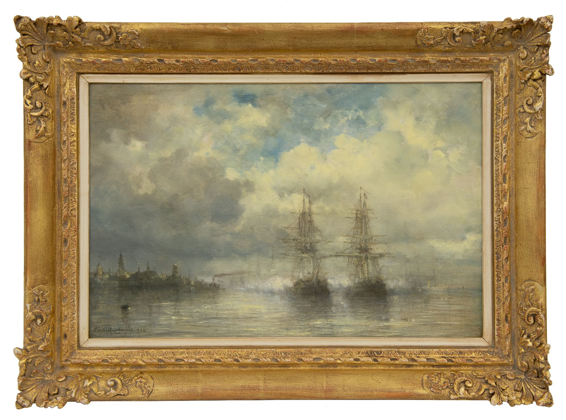 Hendrik Schaefels kunstwerk • schilderij • te koop Driemasters op de Schelde bij Antwerpen