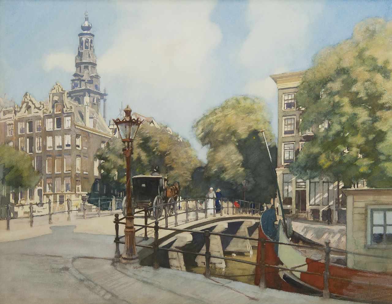 Hendrik Willebrord Jansen kunstwerk • aquarel • tekening • voorheen te koop Gezicht op de brug over de Kloveniersburgwal, Amsterdam