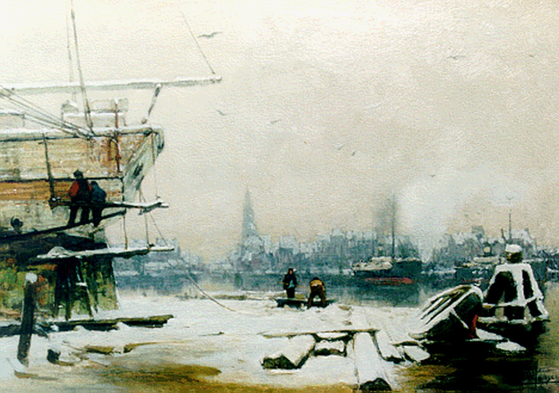 Hendrik Willebrord Jansen kunstwerk • schilderij • voorheen te koop Winters gezicht op haven Amsterdam