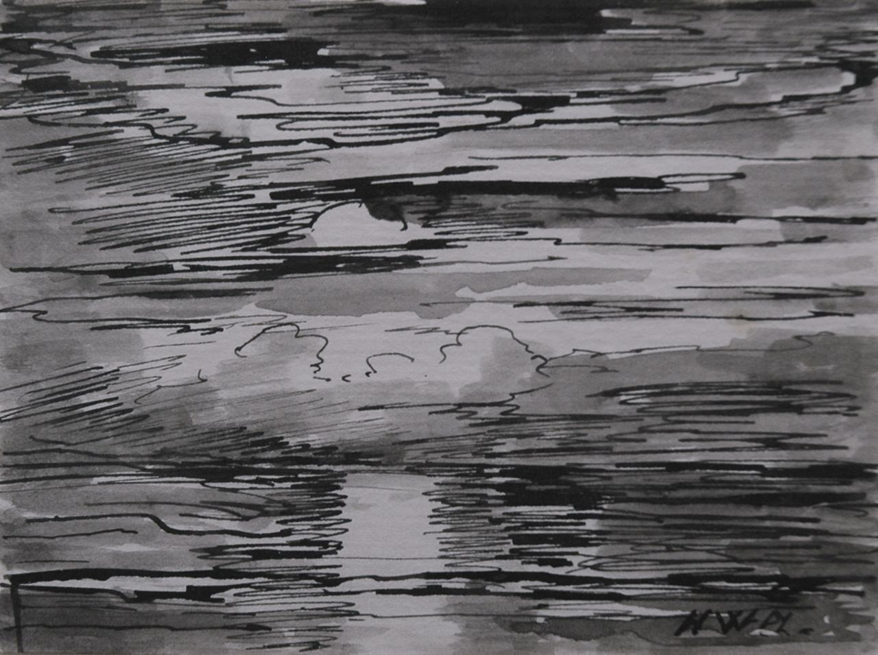 pen en penseel in zwarte inkt op papier op karton 8,7 x 11,2 cm, gesigneerd rechtsonder met initialen
