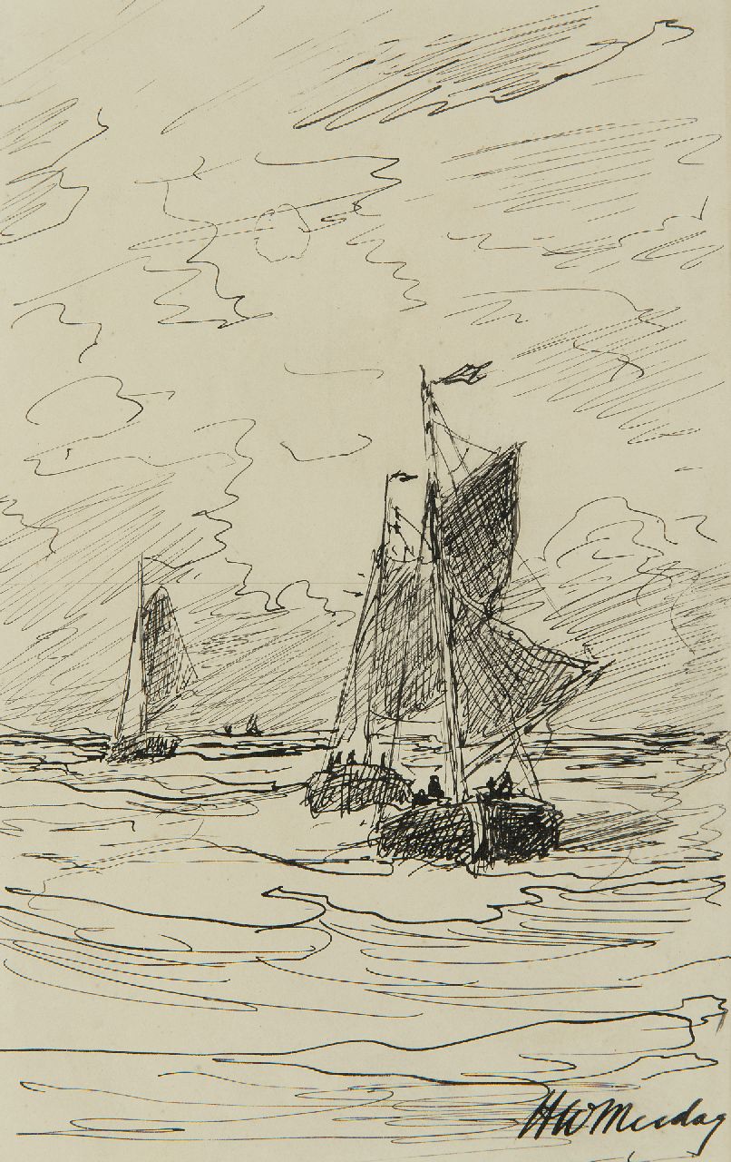 Hendrik Willem Mesdag kunstwerk • aquarel • tekening • voorheen te koop Bomschuiten op zee