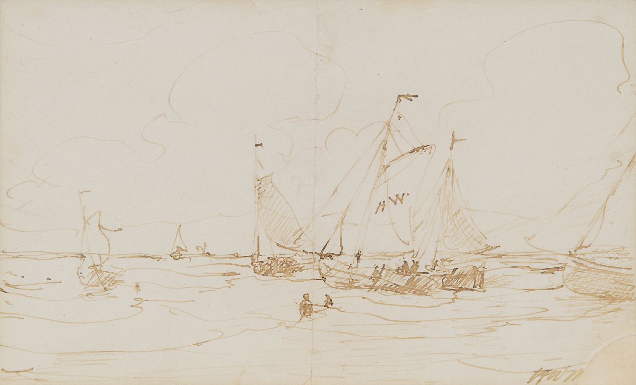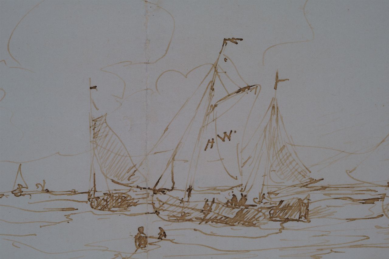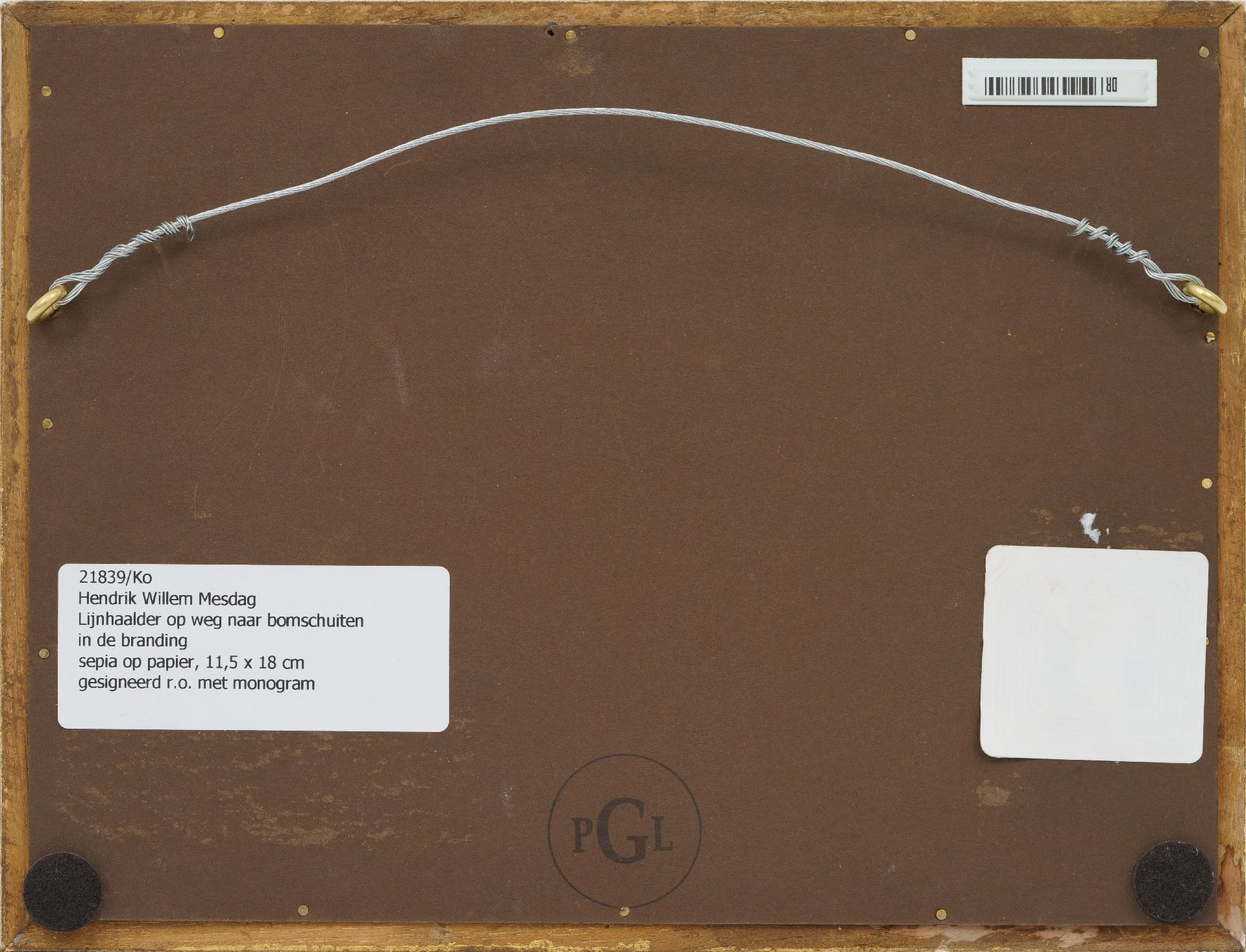 Hendrik Willem Mesdag kunstwerk • aquarel • tekening • voorheen te koop Lijnhaalder en bomschuiten in de branding