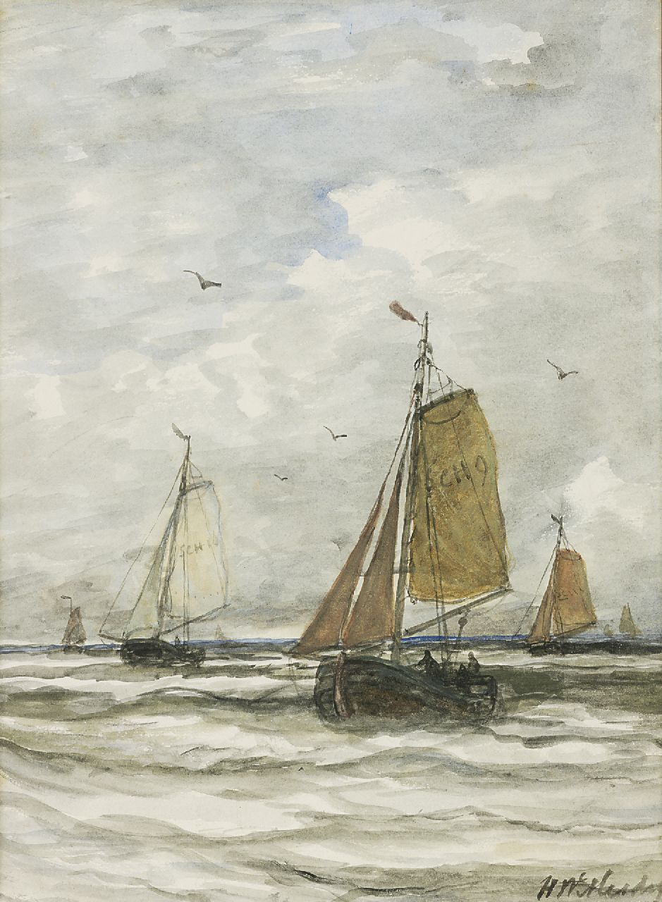 Hendrik Willem Mesdag kunstwerk • aquarel • tekening • voorheen te koop Scheveningse bomschuiten op volle zee