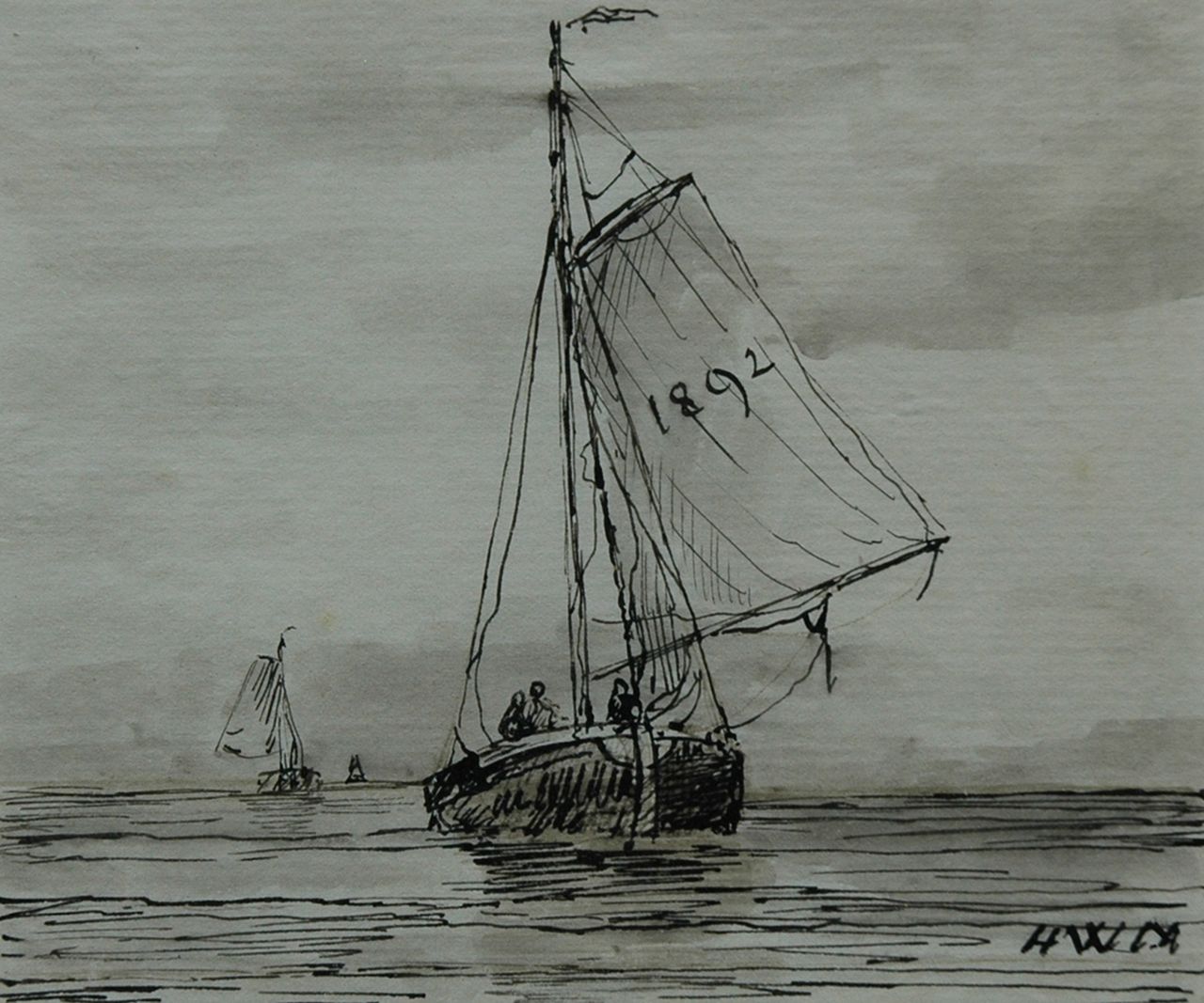 pen en penseel in inkt op papier 9,6 x 11,5 cm, gesigneerd rechtsonder met initialen en gedateerd 1892 op het zeil