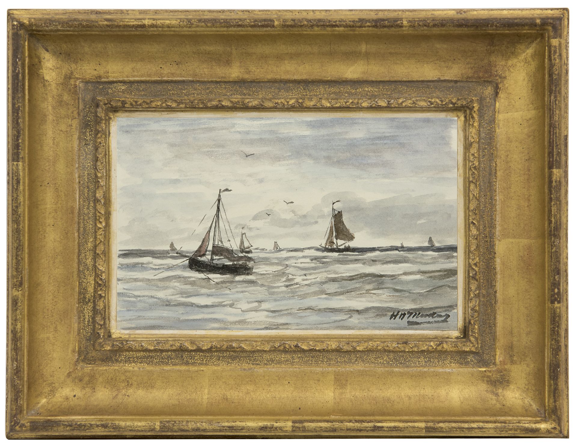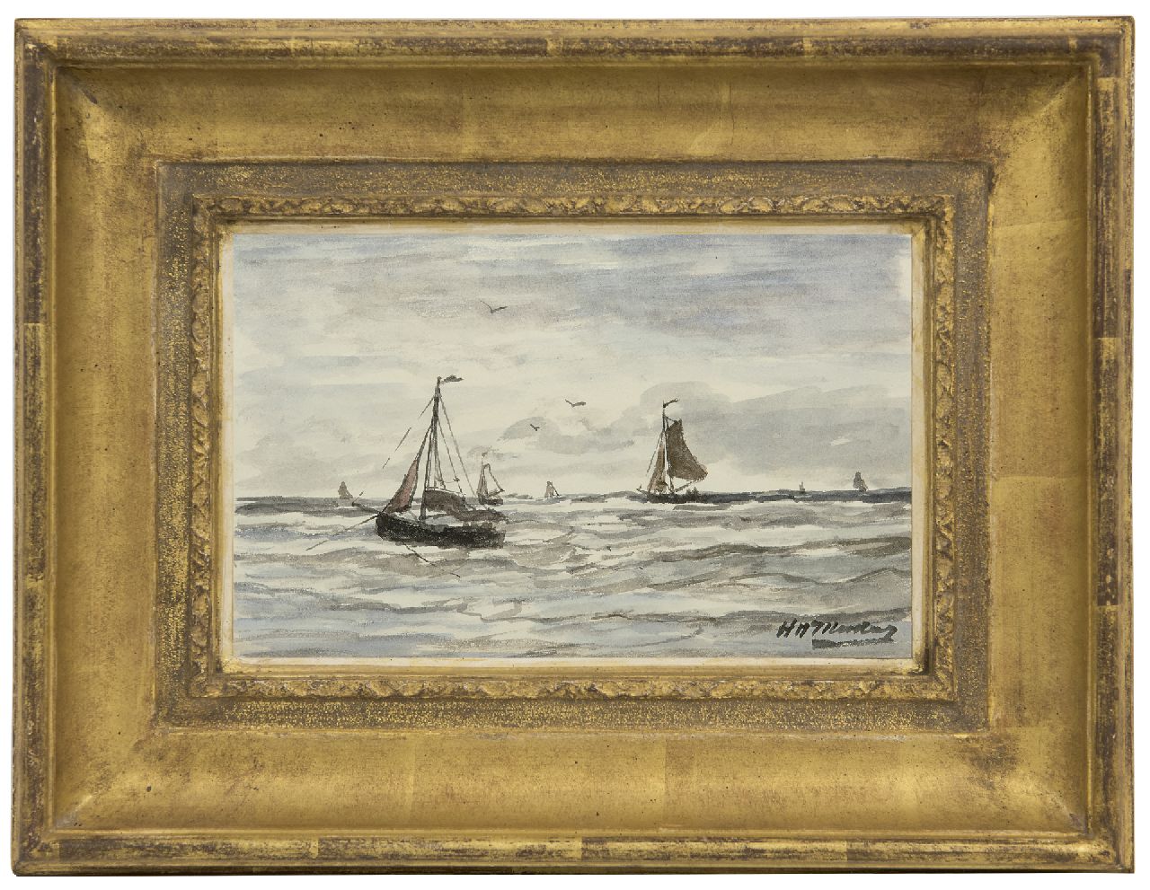 Hendrik Willem Mesdag kunstwerk • aquarel • tekening • voorheen te koop Vissersschepen in de branding, Scheveningen