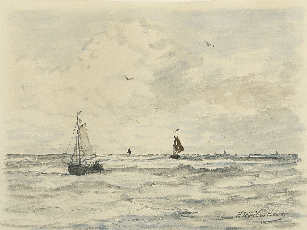 Hendrik Willem Mesdag kunstwerk • aquarel • tekening • voorheen te koop Vissersschepen op zee