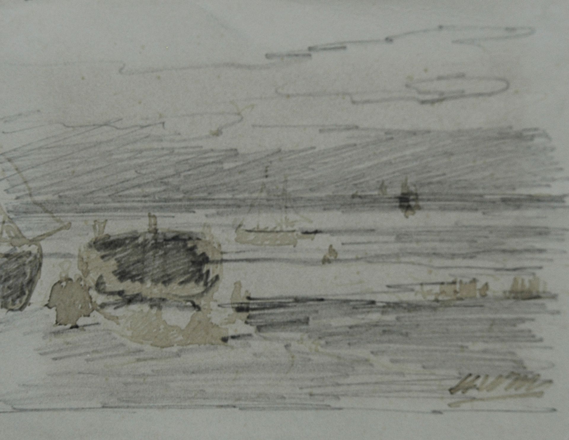 Hendrik Willem Mesdag kunstwerk • aquarel • tekening • voorheen te koop Vissersvolk en bommen op het strand