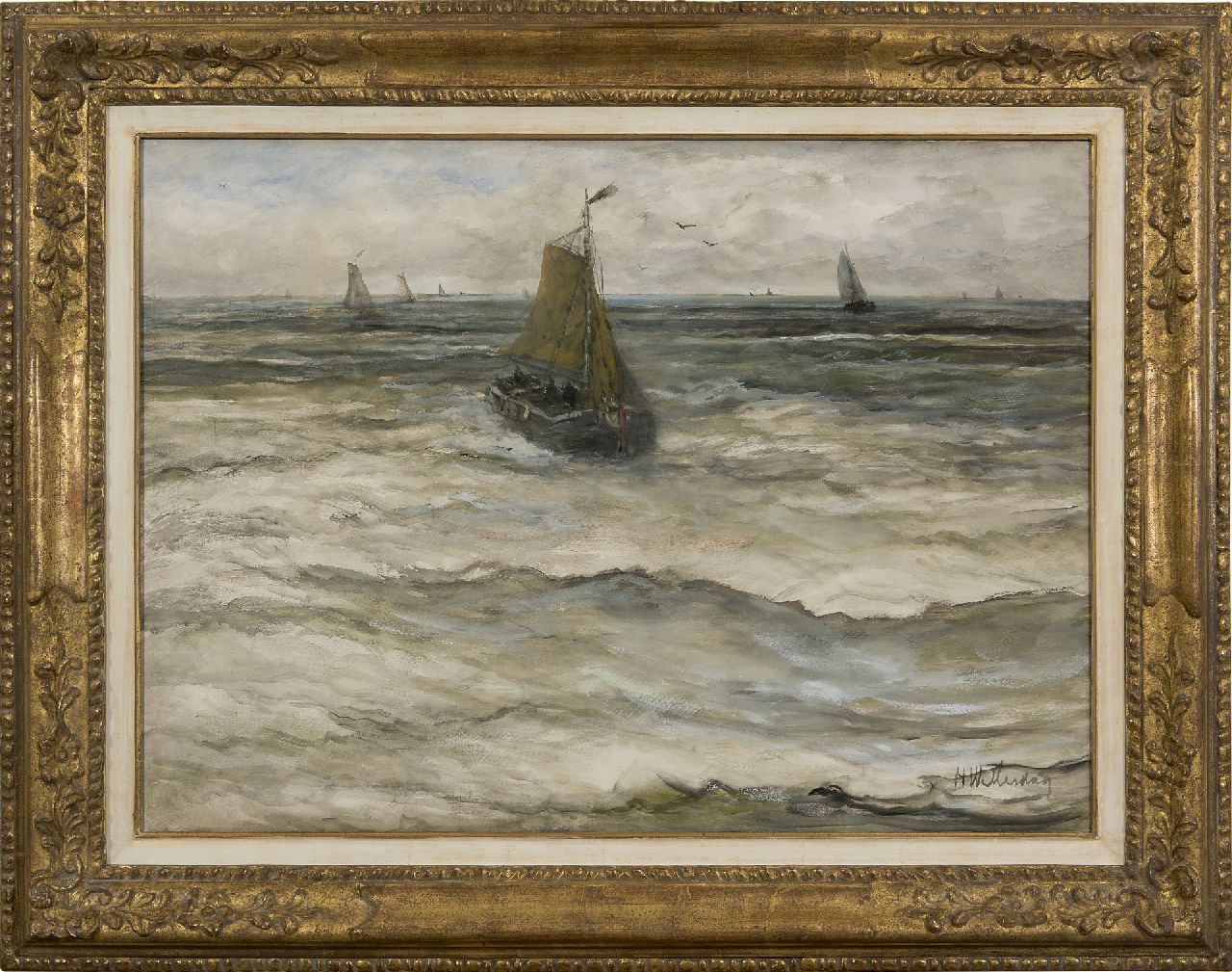 H.W. Mesdag, de zeeschilder van de Haagse School, koos op relatief late leeftijd voor het schildersvak. Na een verblijf in Oosterbeek en Brussel vestigde de schilder zich in 1869 in Den Haag, waar hij direct geboeid werd door het strand, de zee en het leven van de Scheveningse vissers. In een snelle, losse toets en een eindeloze variatie aan bruine, gouden en grijze kleuren bracht hij deze motieven op het doek. Mesdag had een grote productie, als wilde hij alle verloren tijd inhalen. Zijn werk was in Frankrijk zeer geliefd en werd verschillende malen bekroond op de 'Salon' van Parijs.