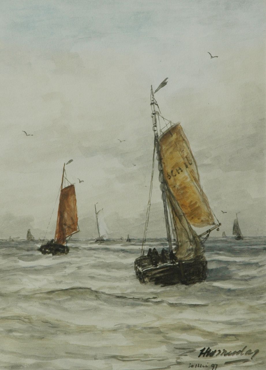 Hendrik Willem Mesdag kunstwerk • aquarel • tekening • voorheen te koop Bomschuiten op zee