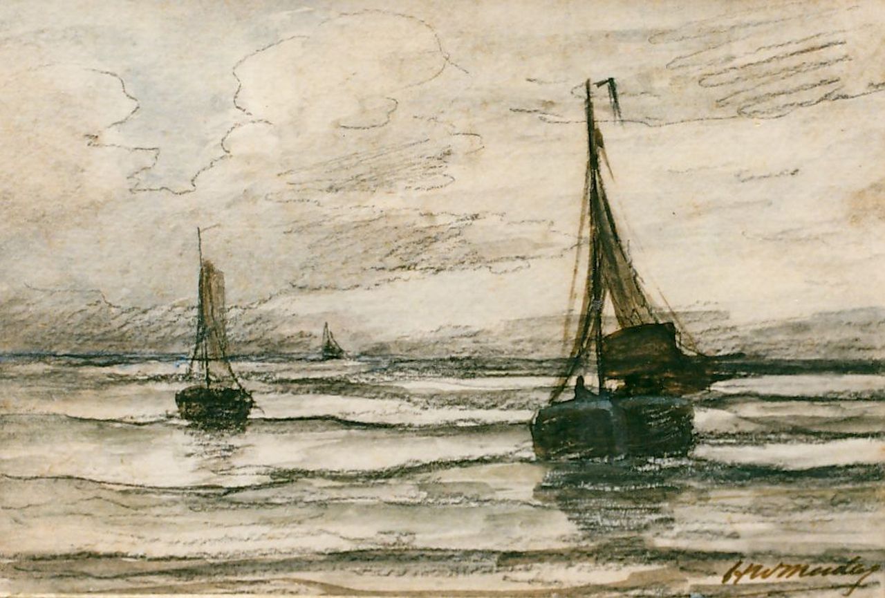 Hendrik Willem Mesdag kunstwerk • aquarel • tekening • voorheen te koop Bomschuiten op zee
