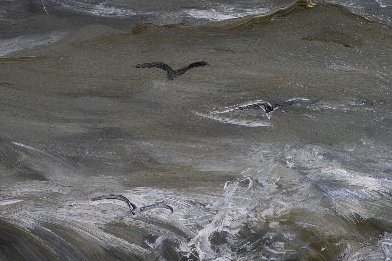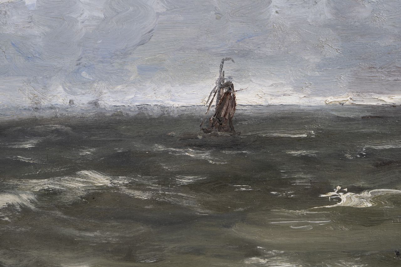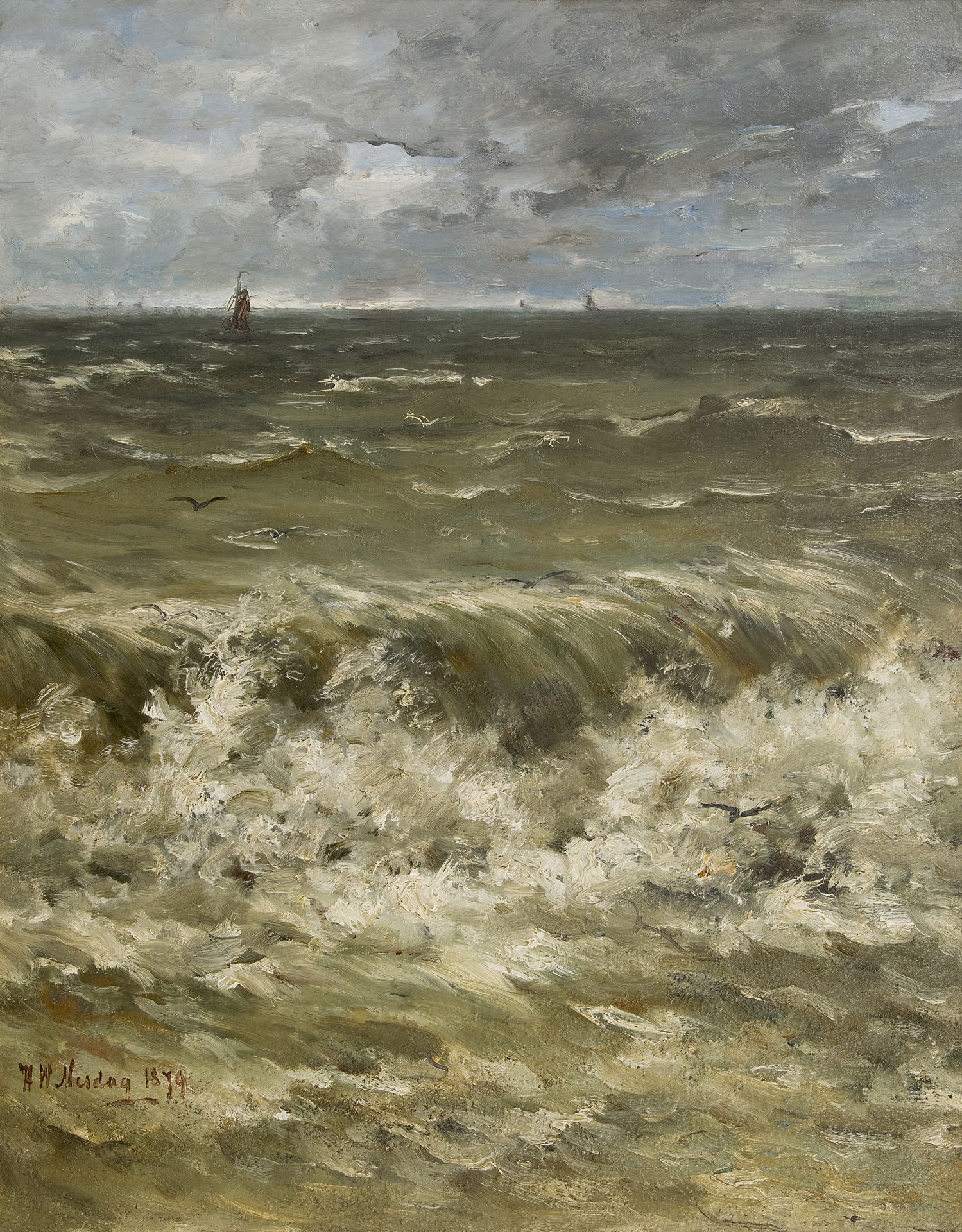 Je moet het maar durven, bijna niets anders dan de branding van de zee schilderen... Mesdag deed het en zou er beroemd mee worden. Het meest bekende werk met dit thema was 'Les Brisants de la Mer du Nord', dat door hem omstreeks 1869-'70 werd gemaakt. Mesdag, die aanvankelijk landschappen schilderde, richtte zich tegen het einde van de jaren '60 van de 19e eeuw meer en meer op het zeegezicht, het thema waarmee hij naam en faam zou maken. In die aanloop naar het autonome zeegezicht dat hij later steeds meer van vissersschepen zou voorzien, maakte hij een voorstelling met de branding van de Noordzee als onderwerp. Het schilderij kreeg veel bijval en leverde Mesdag in 1870 op de befaamde Salon in Parijs een gouden medaille op.