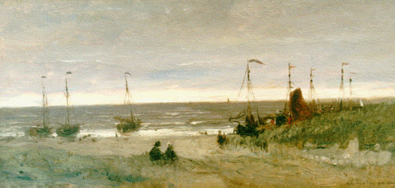 Hendrik Willem Mesdag kunstwerk • schilderij • voorheen te koop Doorkijkje vanaf de duinen op het strand met bomschuiten