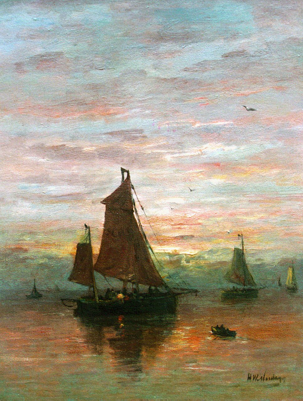 Hendrik Willem Mesdag kunstwerk • schilderij • voorheen te koop Schepen voor de kust met roeiboot